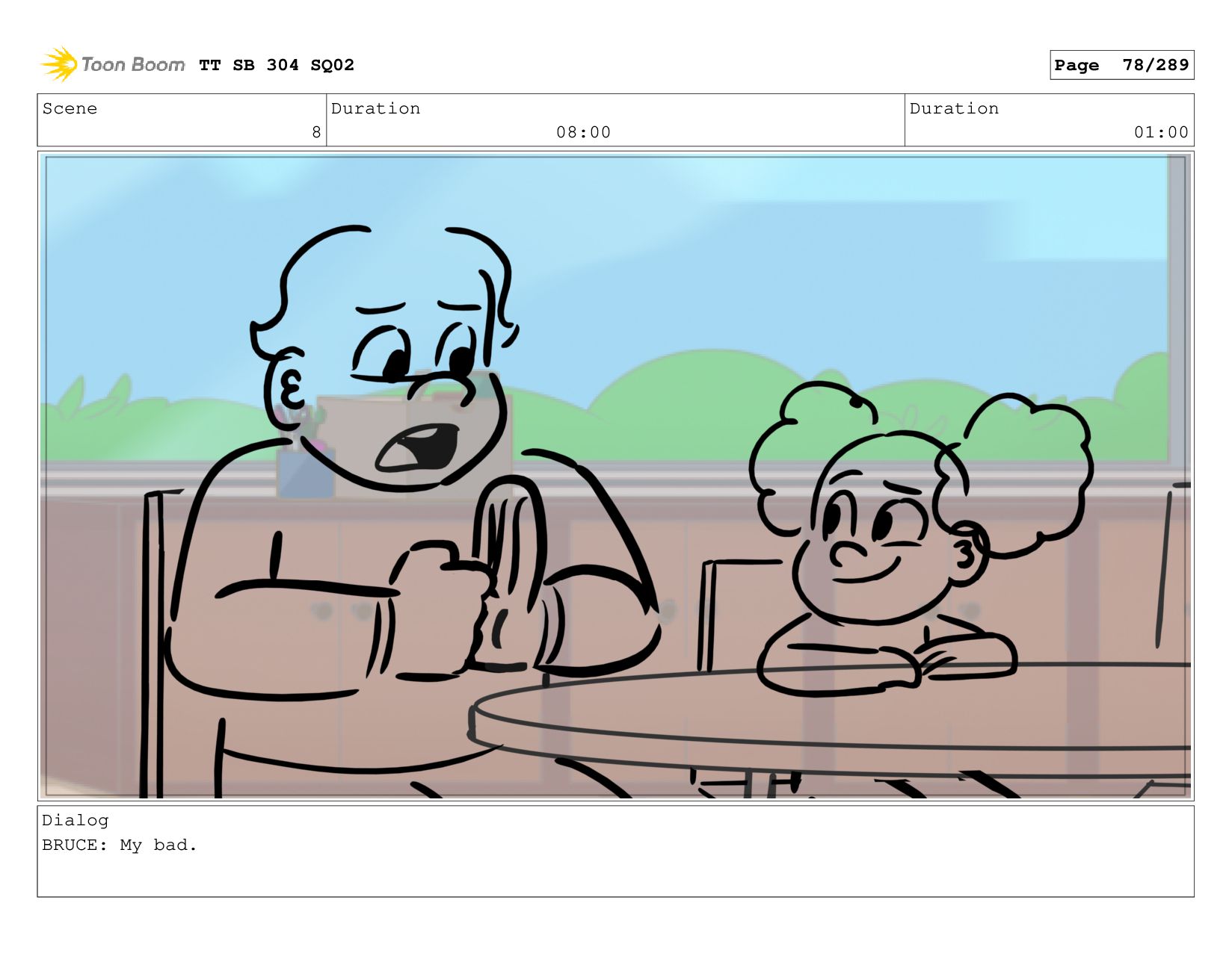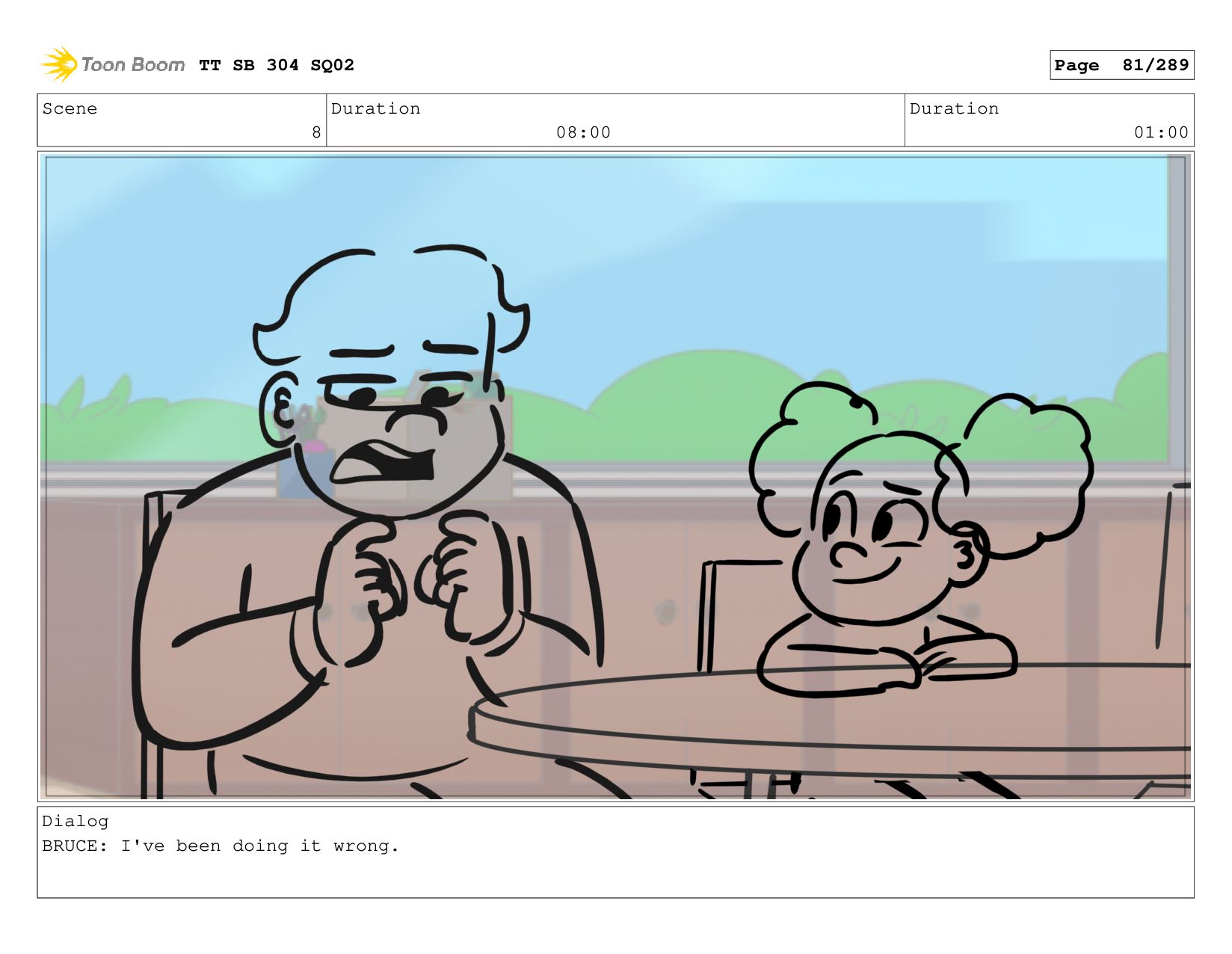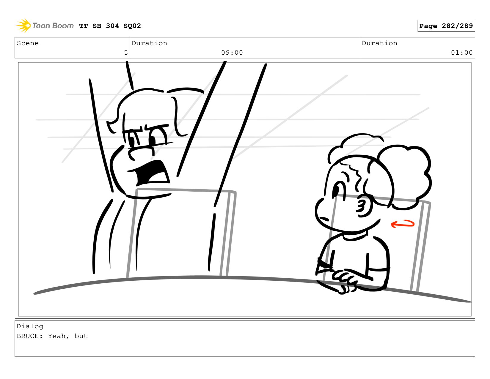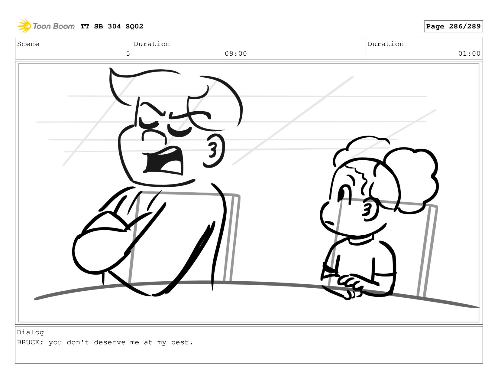 Scene 5 Duration 09:00 Duration 01:00 Dialog BRUCE: Hrmph. TT