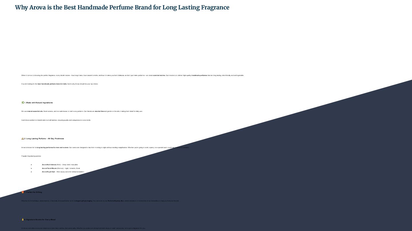 Discover the essence of elegance with Arova – a premium range of handmade perfumes crafted in Surat. This presentation offers a detailed look into our brand story, fragrance collections, ingredients used, and what makes Arova perfumes long lasting and unique. Perfect for fragrance lovers and retailers seeking natural, locally made scents.