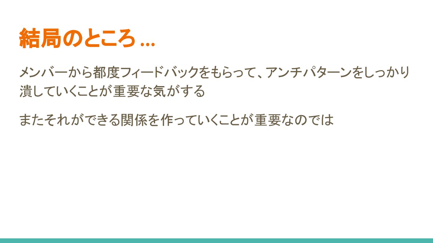 結局のところ … メンバーから都度フィードバックをもらって、アンチパターンをしっかり 潰していくことが重要な気がする またそれができる関係を作っていくことが重要なのでは
