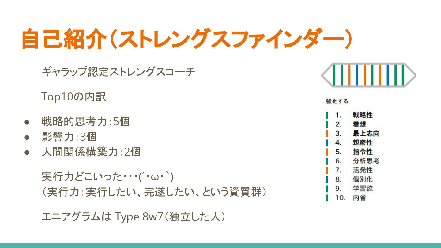 自己紹介(ストレングスファインダー) ギャラップ認定ストレングスコーチ Top10の内訳 • 戦略的思考力:5個 • 影響力:3個 • 人間関係構築力:2個 実行力どこいった・・・(´・ω・`)