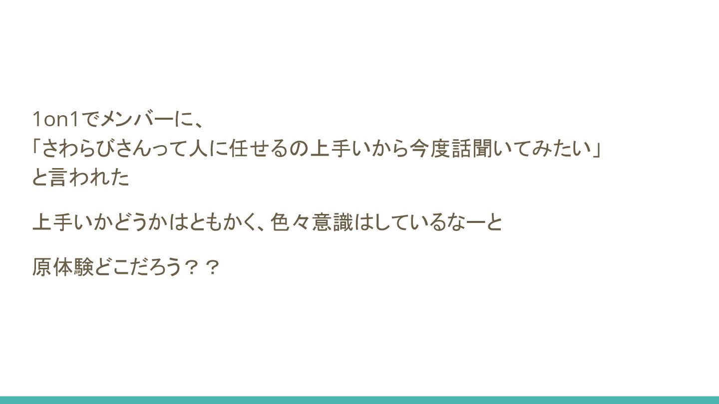 1on1でメンバーに、 「さわらびさんって人に任せるの上手いから今度話聞いてみたい」 と言われた 上手いかどうかはともかく、色々意識はしているなーと 原体験どこだろう??