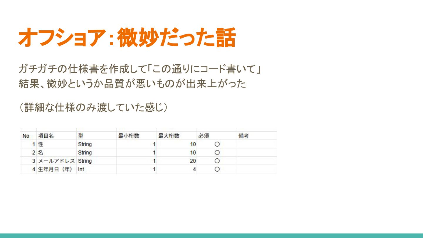 オフショア:微妙だった話 ガチガチの仕様書を作成して「この通りにコード書いて」 結果、微妙というか品質が悪いものが出来上がった (詳細な仕様のみ渡していた感じ)