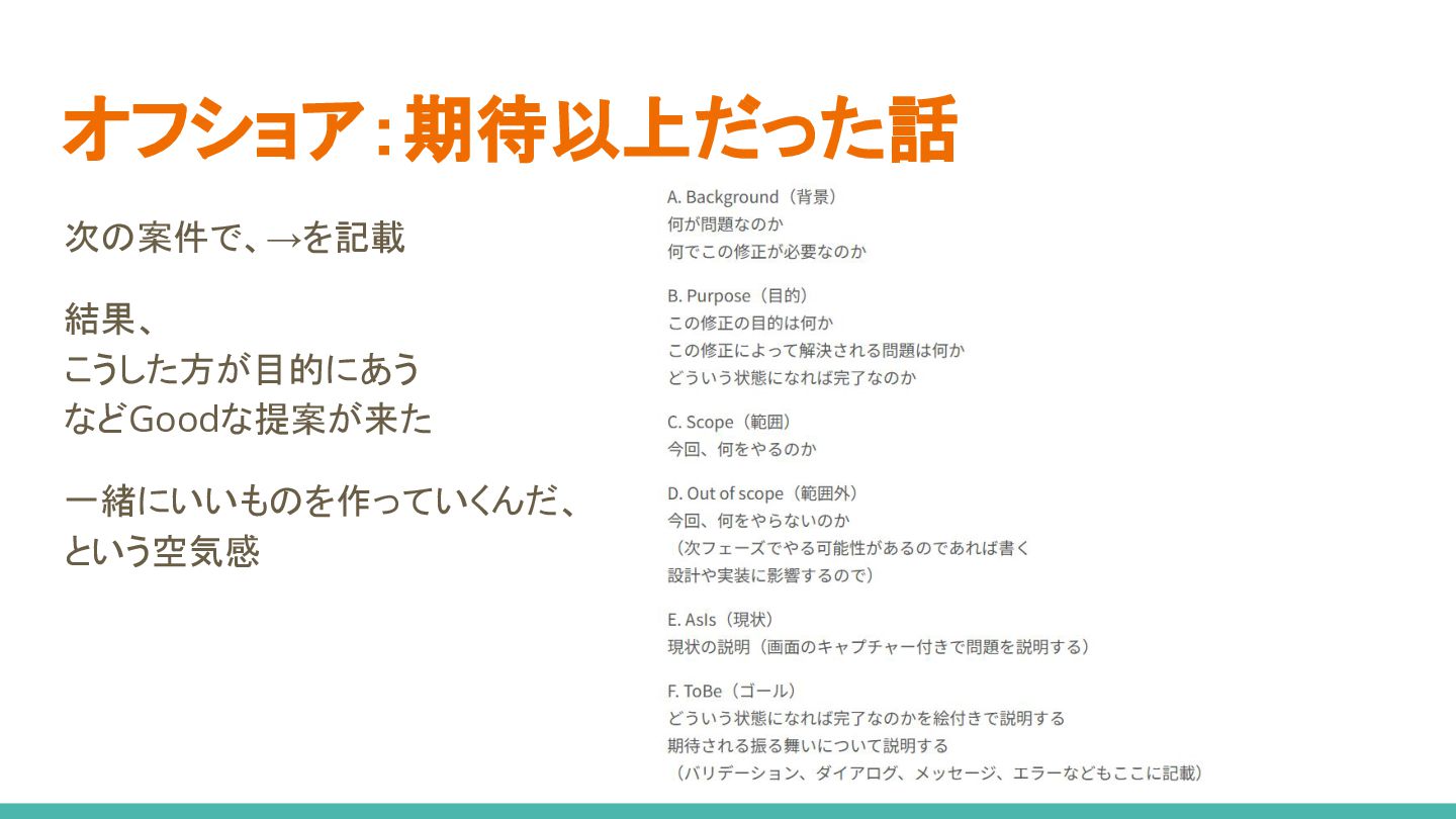 オフショア:期待以上だった話 次の案件で、→を記載 結果、 こうした方が目的にあう などGoodな提案が来た 一緒にいいものを作っていくんだ、 という空気感