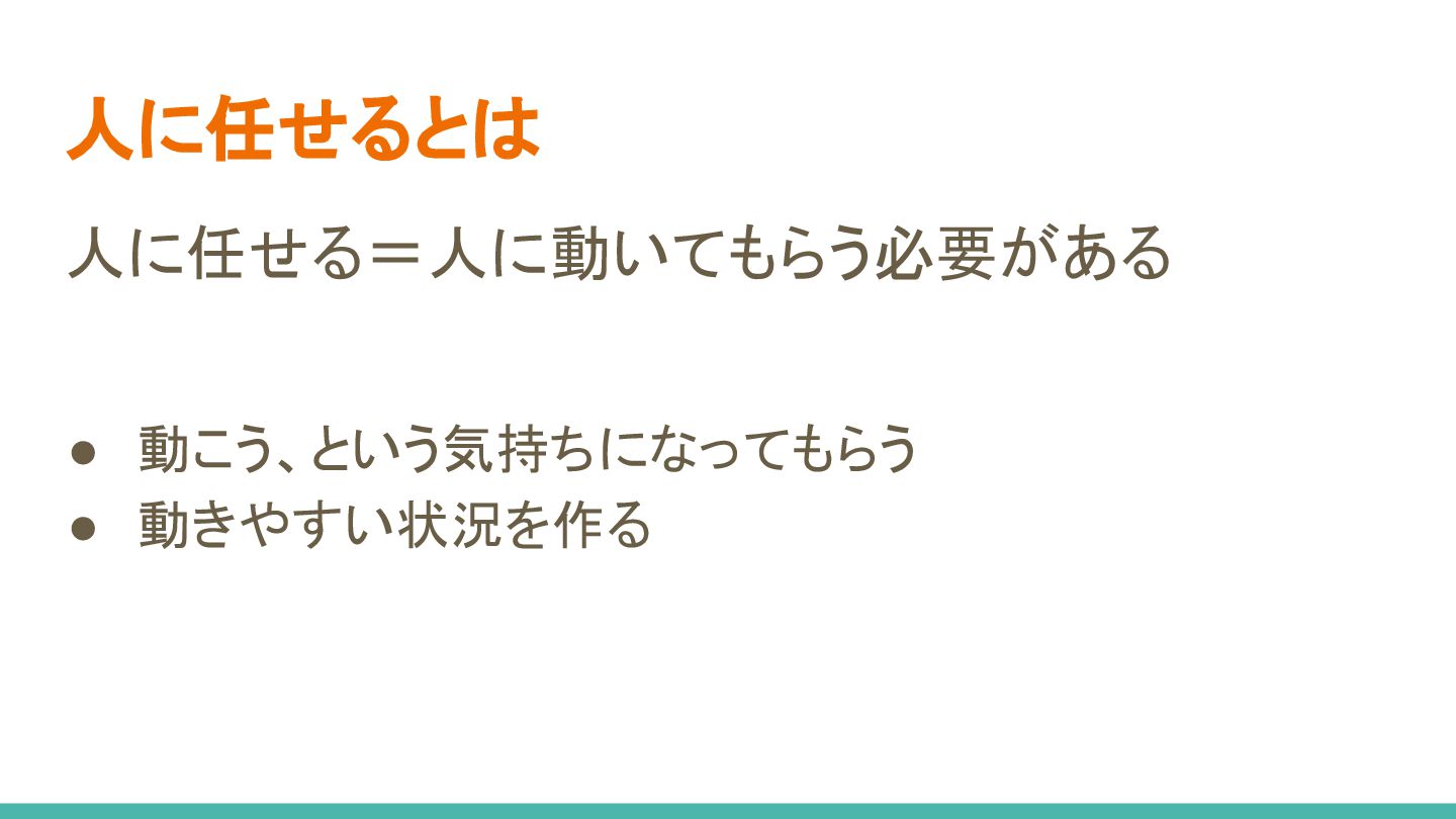 人に任せるとは 人に任せる=人に動いてもらう必要がある • 動こう、という気持ちになってもらう • 動きやすい状況を作る