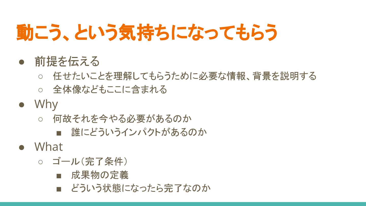 動こう、という気持ちになってもらう • 前提を伝える ◦ 任せたいことを理解してもらうために必要な情報、背景を説明する ◦ 全体像などもここに含まれる • Why ◦