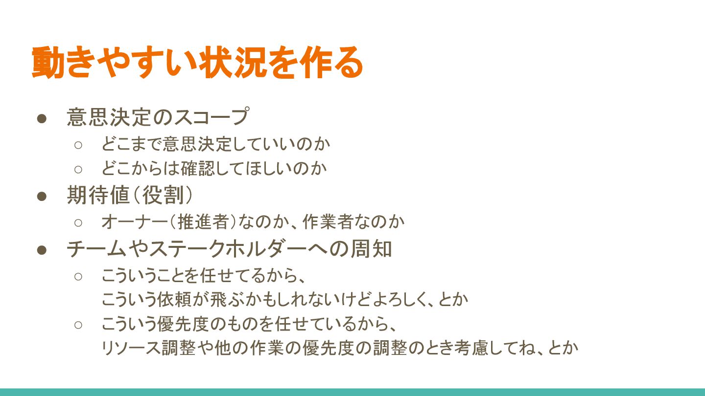 動きやすい状況を作る • 意思決定のスコープ ◦ どこまで意思決定していいのか ◦ どこからは確認してほしいのか • 期待値(役割) ◦