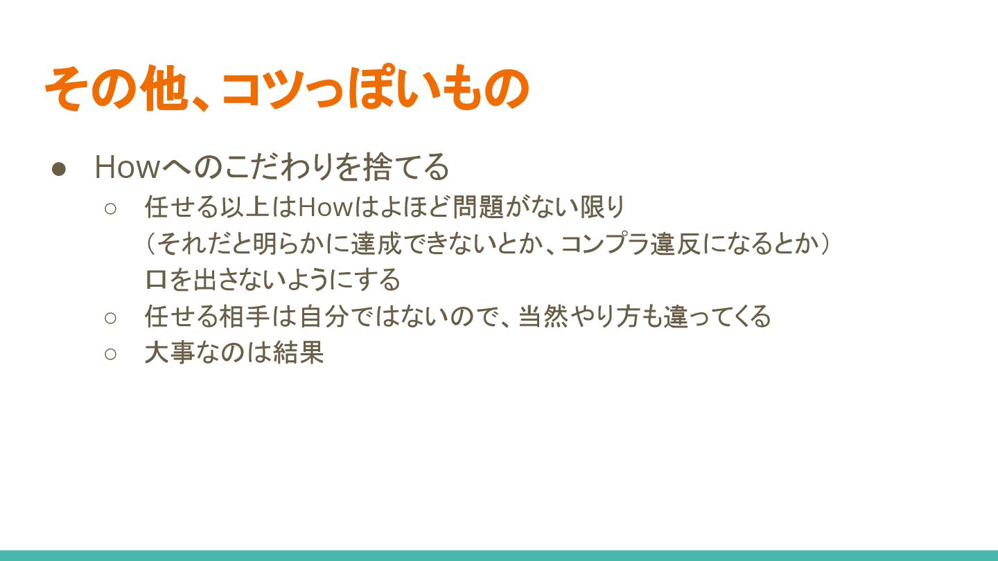 その他、コツっぽいもの • Howへのこだわりを捨てる ◦ 任せる以上はHowはよほど問題がない限り (それだと明らかに達成できないとか、コンプラ違反になるとか) 口を出さないようにする ◦ 任せる相手は自分ではないので、当然やり方も違ってくる ◦
