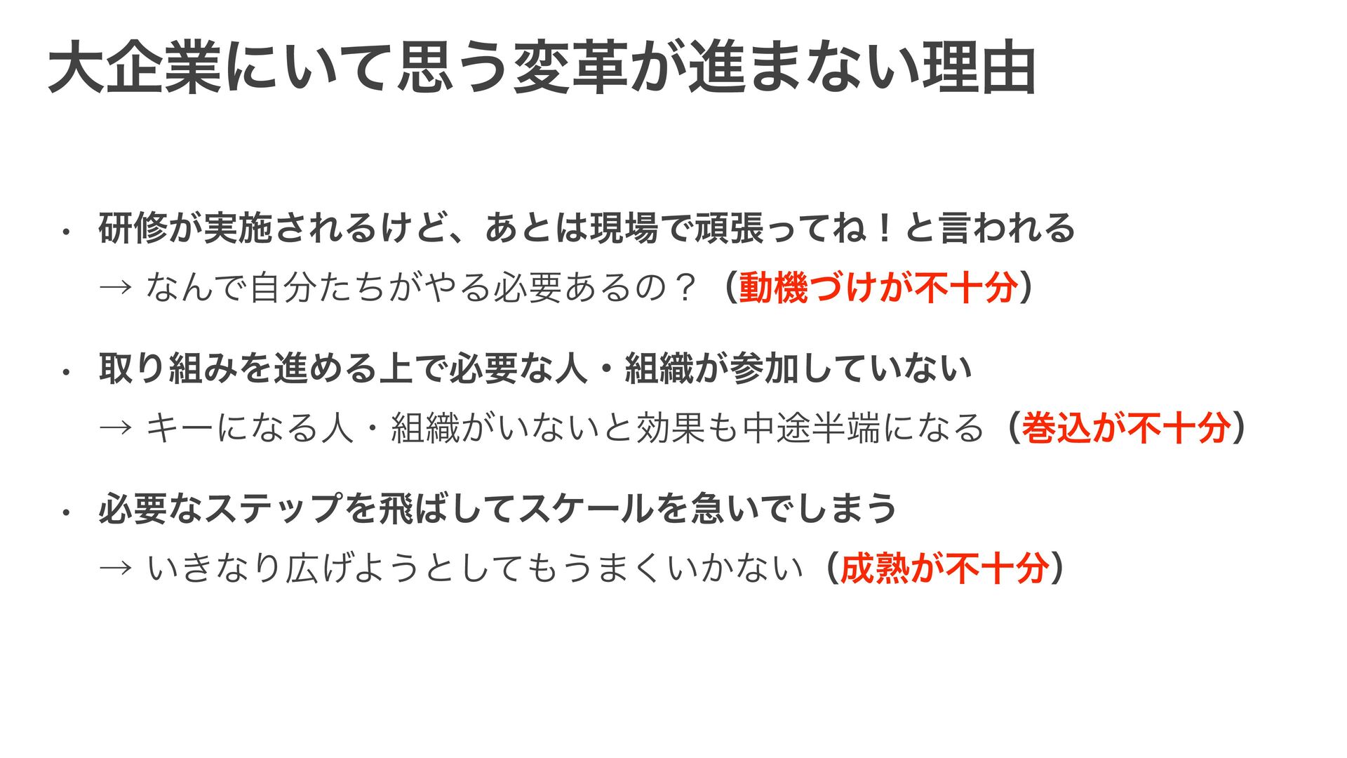 େاۀʹ͍ͯࢥ͏มֵ͕ਐ·ͳ͍ཧ༝ w ݚम͕࣮ࢪ͞ΕΔ͚Ͳɺ͋ͱݱͰؤுͬͯͶʂͱݴΘΕΔ ˠͳΜͰ͕ࣗͨͪΔඞཁ͋Δͷʁʢಈػ͚͕ͮෆेʣ w औΓΈΛਐΊΔ্Ͱඞཁͳਓɾ৫͕ࢀՃ͍ͯ͠ͳ͍ ˠΩʔʹͳΔਓɾ৫͕͍ͳ͍ͱޮՌத్ʹͳΔʢרࠐ͕ෆेʣ w ඞཁͳεςοϓΛඈͯ͠εέʔϧΛٸ͍Ͱ͠·͏ ˠ͍͖ͳΓ͛Α͏ͱͯ͠͏·͍͔͘ͳ͍ʢख़͕ෆेʣ