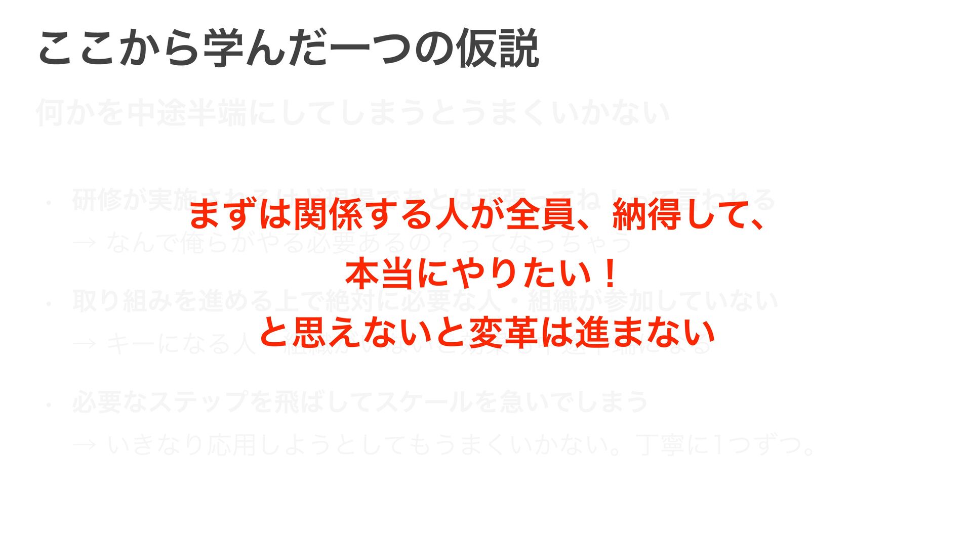 ͔͜͜ΒֶΜͩҰͭͷԾઆ w ݚम͕࣮ࢪ͞ΕΔ͚ͲݱͰ͋ͱؤுͬͯͶʂͬͯݴΘΕΔ ˠͳΜͰԶΒ͕Δඞཁ͋ΔͷʁͬͯͳͬͪΌ͏ w औΓΈΛਐΊΔ্Ͱઈରʹඞཁͳਓɾ৫͕ࢀՃ͍ͯ͠ͳ͍ ˠΩʔʹͳΔਓɾ৫͕͍ͳ͍ͱޮՌத్ʹͳΔ w ඞཁͳεςοϓΛඈͯ͠εέʔϧΛٸ͍Ͱ͠·͏ ˠ͍͖ͳΓԠ༻͠Α͏ͱͯ͠͏·͍͔͘ͳ͍ɻஸೡʹͭͣͭɻ