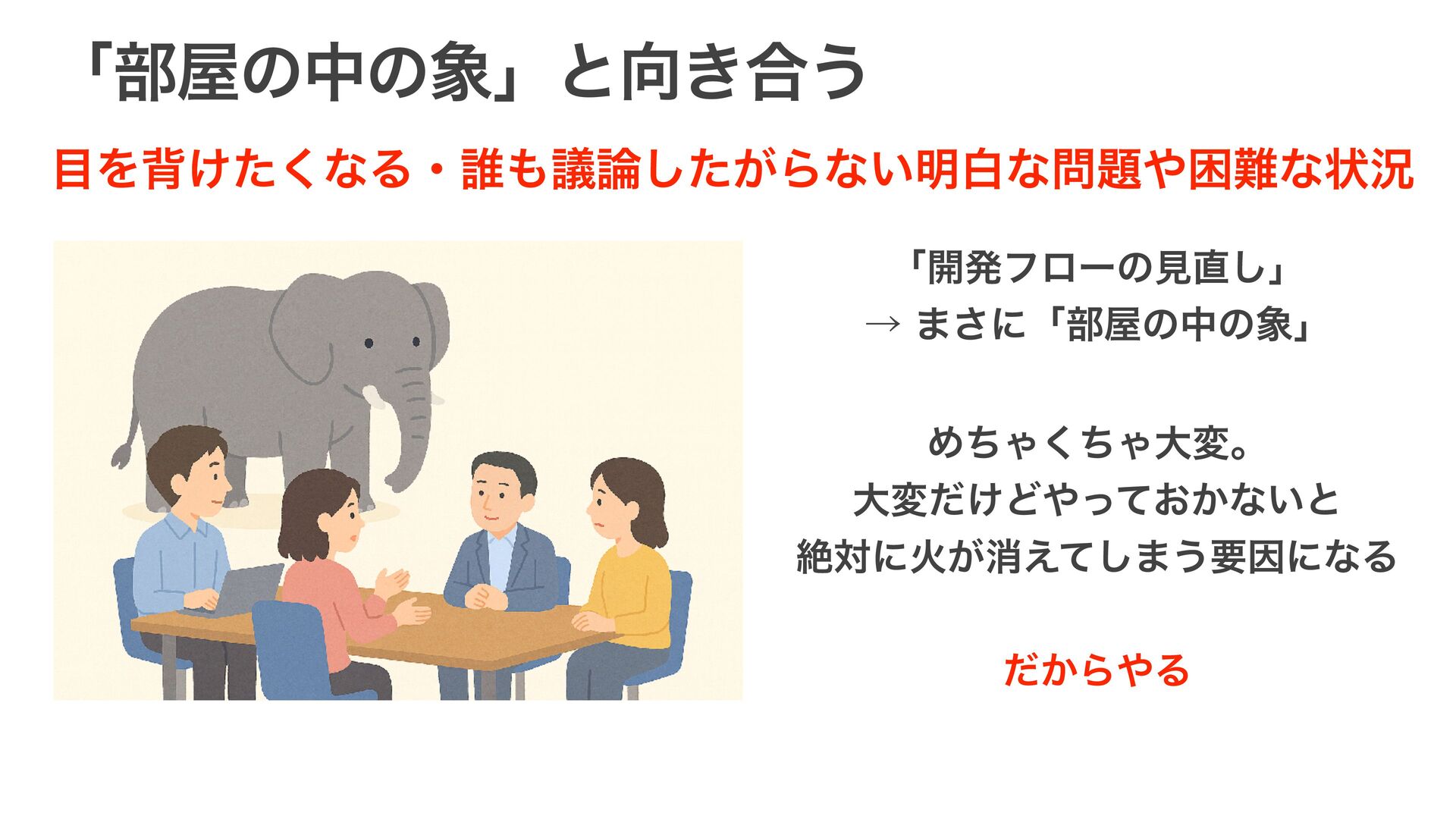 ʮ෦ͷதͷʯͱ͖߹͏ Λഎ͚ͨ͘ͳΔɾ୭͕ٞͨ͠Βͳ͍໌നͳࠔͳঢ়گ ʮ։ൃϑϩʔͷݟ͠ʯ ˠ·͞ʹʮ෦ͷதͷʯ ΊͪΌͪ͘Όେมɻ େม͚ͩͲ͓͔ͬͯͳ͍ͱ ઈରʹՐ͕ফ͑ͯ͠·͏ཁҼʹͳΔ ͔ͩΒΔ