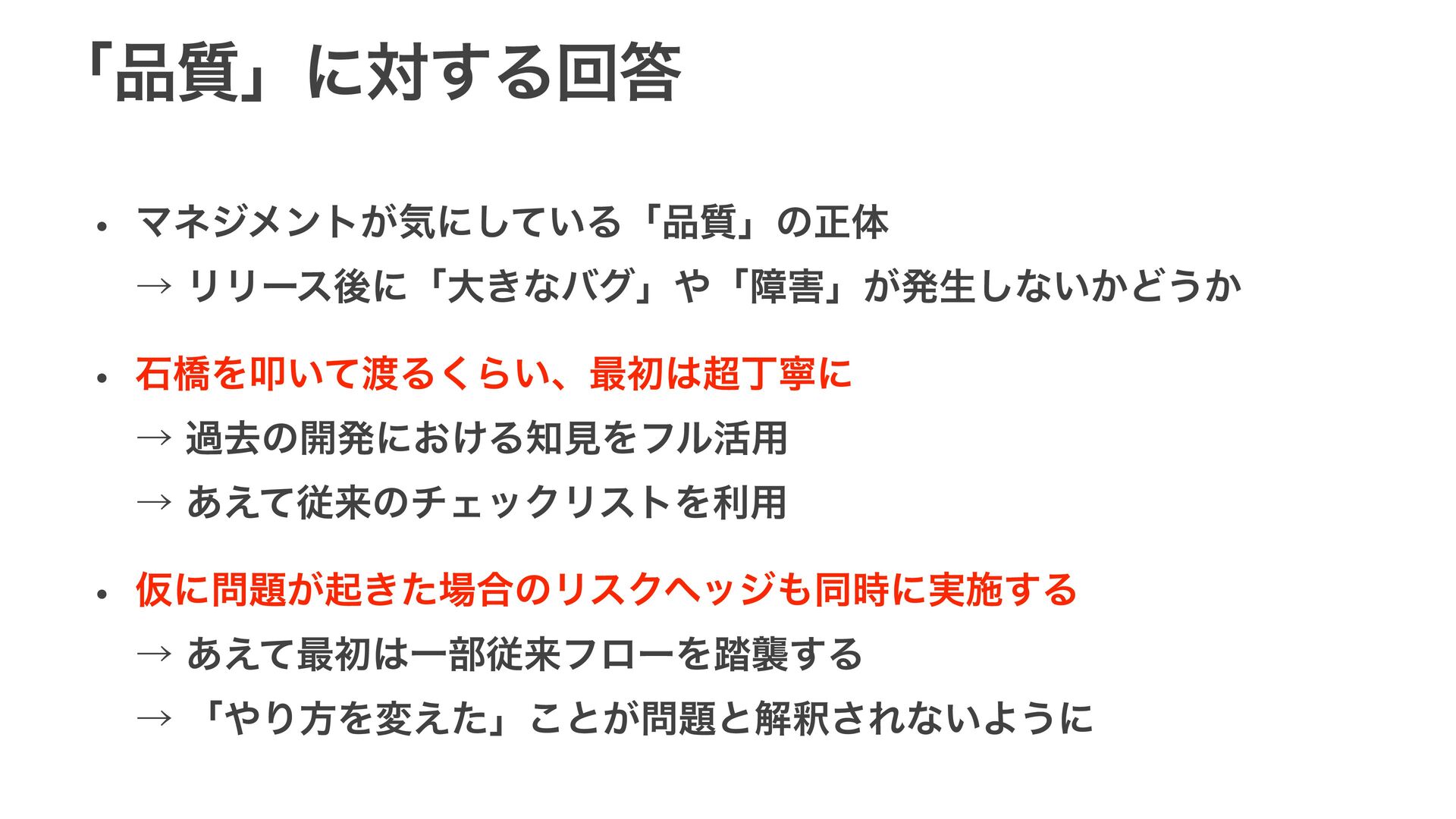 w Ϛωδϝϯτ͕ؾʹ͍ͯ͠Δʮ࣭ʯͷਖ਼ମ ˠϦϦʔεޙʹʮେ͖ͳόάʯʮোʯ͕ൃੜ͠ͳ͍͔Ͳ͏͔ w ੴڮΛୟ͍ͯΔ͘Β͍ɺ࠷ॳஸೡʹ ˠաڈͷ։ൃʹ͓͚ΔݟΛϑϧ׆༻ ˠ͋͑ͯैདྷͷνΣοΫϦετΛར༻ w Ծʹ͕ى͖ͨ߹ͷϦεΫϔοδಉ࣌ʹ࣮ࢪ͢Δ ˠ͋͑ͯ࠷ॳҰ෦ैདྷϑϩʔΛ౿ऻ͢Δ