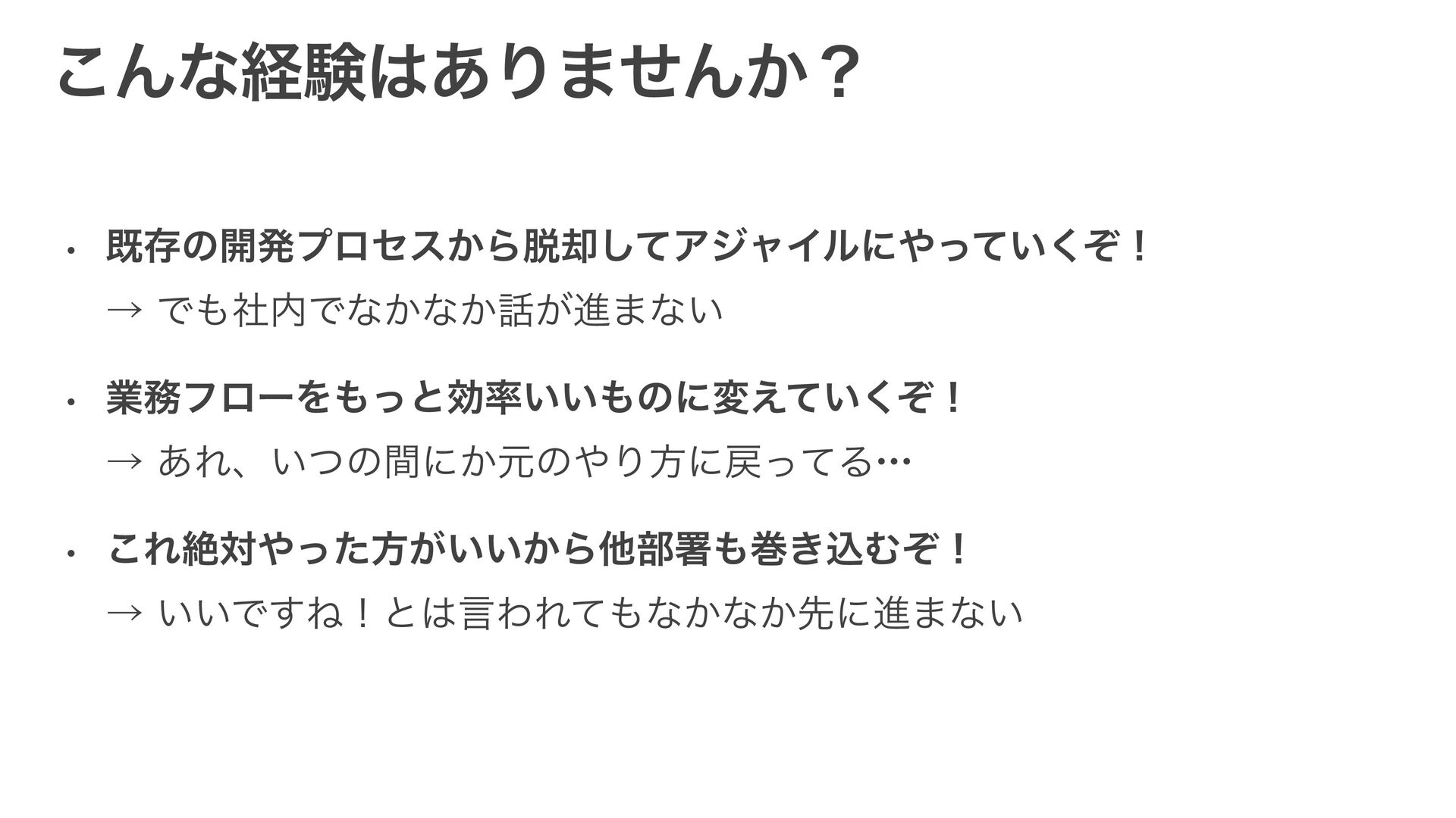 ͜Μͳܦݧ͋Γ·ͤΜ͔ʁ w طଘͷ։ൃϓϩηε͔Β٫ͯ͠ΞδϟΠϧʹ͍ͬͯͧ͘ʂ ˠͰࣾͰͳ͔ͳ͔͕ਐ·ͳ͍ w ۀϑϩʔΛͬͱޮ͍͍ͷʹม͍͑ͯͧ͘ʂ ˠ͋Εɺ͍ͭͷؒʹ͔ݩͷΓํʹͬͯΔʜ w ͜Εઈରͬͨํ͕͍͍͔Βଞ෦ॺר͖ࠐΉͧʂ ˠ͍͍Ͱ͢ͶʂͱݴΘΕͯͳ͔ͳ͔ઌʹਐ·ͳ͍