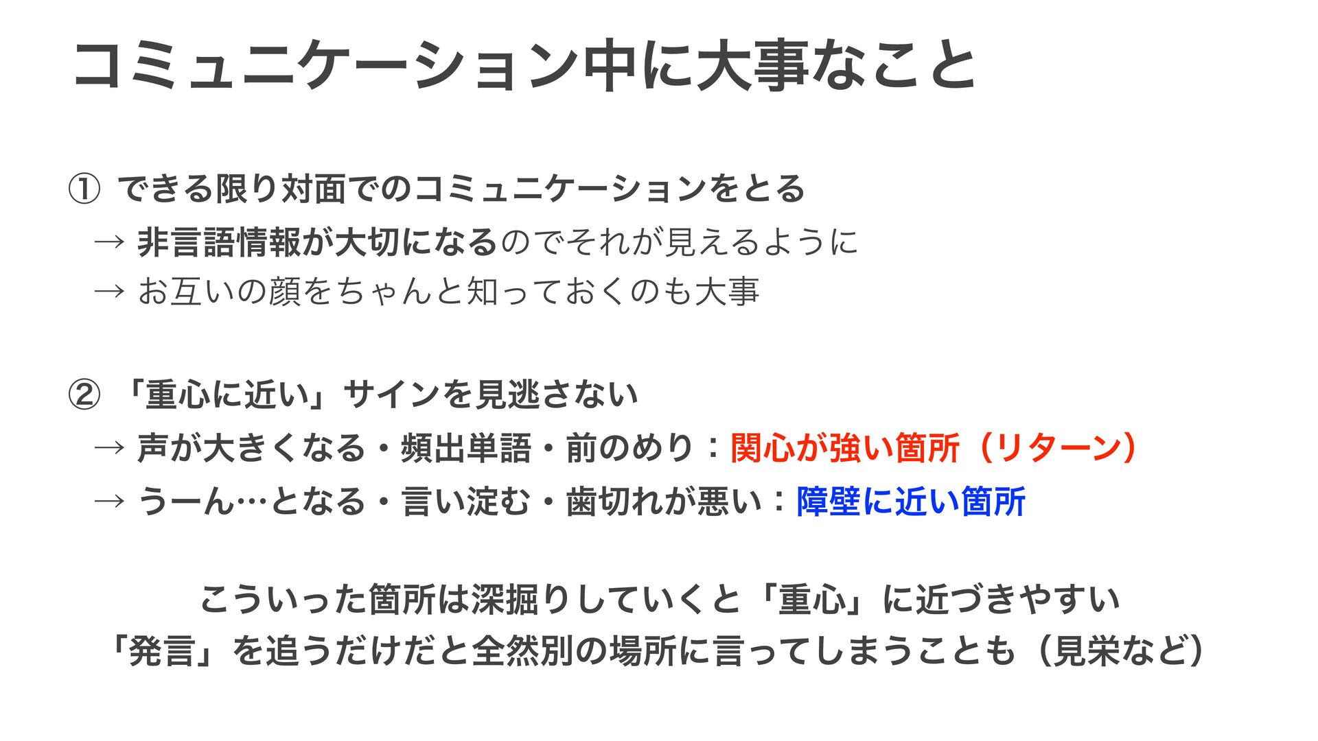 ίϛϡχέʔγϣϯதʹେࣄͳ͜ͱ ᶃ Ͱ͖ΔݶΓର໘ͰͷίϛϡχέʔγϣϯΛͱΔ ˠඇݴޠใ͕େʹͳΔͷͰͦΕ͕ݟ͑ΔΑ͏ʹ ˠ͓ޓ͍ͷإΛͪΌΜͱ͓ͬͯ͘ͷେࣄ ᶄʮॏ৺ʹ͍ۙʯαΠϯΛݟಀ͞ͳ͍ ˠ͕େ͖͘ͳΔɾසग़୯ޠɾલͷΊΓɿؔ৺͕ڧ͍ՕॴʢϦλʔϯʣ ˠ͏ʔΜʜͱͳΔɾݴ͍ཎΉɾࣃΕ͕ѱ͍ɿোนʹ͍ۙՕॴ ͜͏͍ͬͨՕॴਂ۷Γ͍ͯ͘͠ͱʮॏ৺ʯʹ͖͍ۙͮ͢ ʮൃݴʯΛ͏͚ͩͩͱશવผͷॴʹݴͬͯ͠·͏͜ͱʢݟӫͳͲʣ