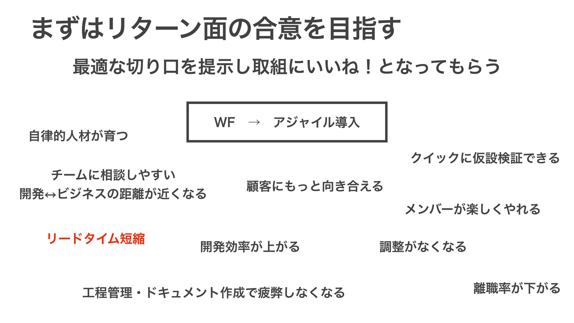 ·ͣϦλʔϯ໘ͷ߹ҙΛࢦ͢ ࠷దͳΓޱΛఏࣔ͠औʹ͍͍ͶʂͱͳͬͯΒ͏ 8'ɹˠɹΞδϟΠϧಋೖ ࣗతਓࡐ͕ҭͭ νʔϜʹ૬ஊ͍͢͠ ։ൃ ↔︎ Ϗδωεͷڑ͕ۙ͘ͳΔ ϦʔυλΠϜॖ ΫΠοΫʹԾઃݕূͰ͖Δ