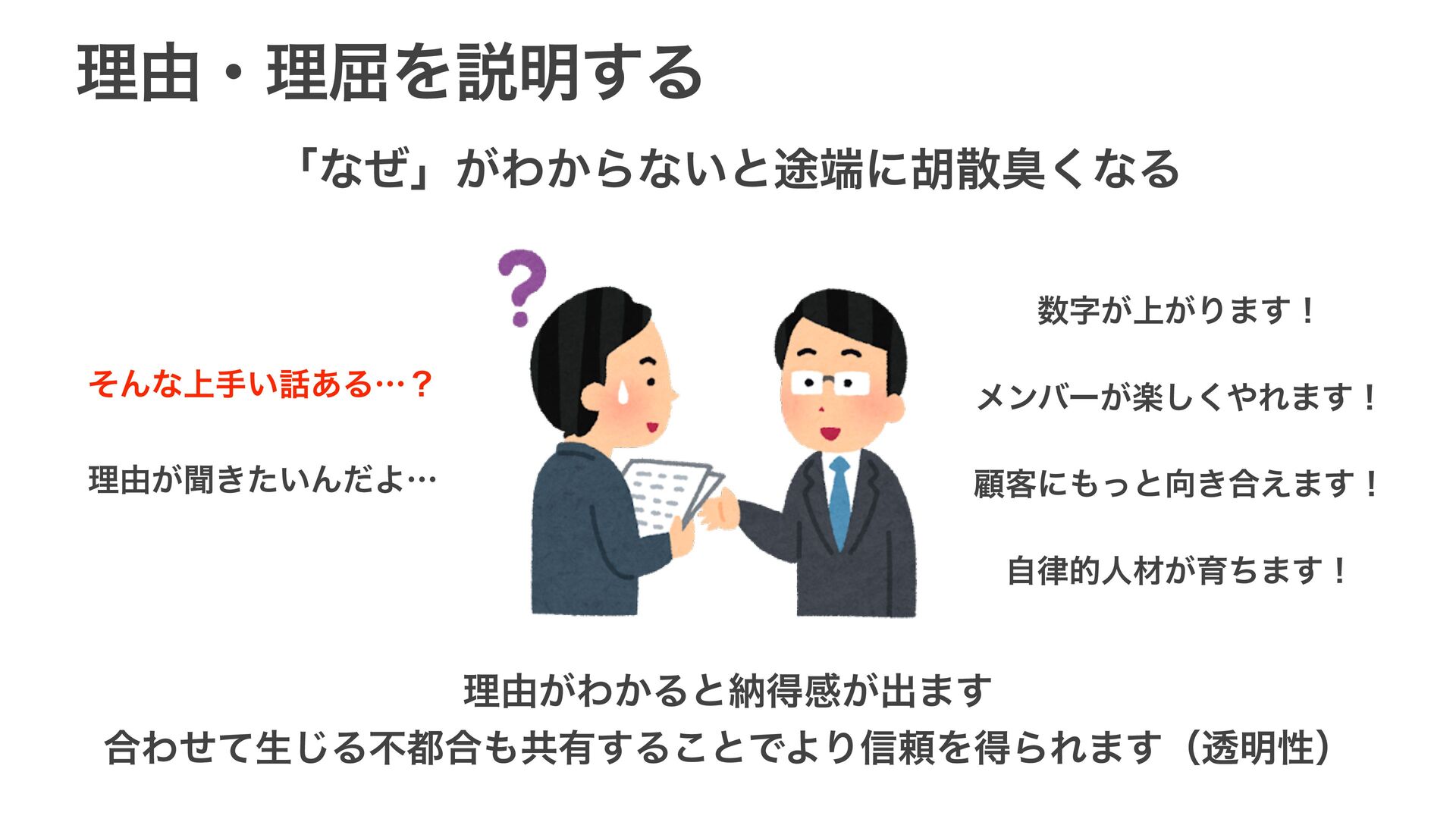 ཧ༝ɾཧ۶Λઆ໌͢Δ ʮͳͥʯ͕Θ͔Βͳ͍ͱ్ʹމࢄष͘ͳΔ ࣈ্͕͕Γ·͢ʂ ࣗతਓࡐ͕ҭͪ·͢ʂ ϝϯόʔָ͕͘͠Ε·͢ʂ ސ٬ʹͬͱ͖߹͑·͢ʂ ͦΜͳ্ख͍͋Δʜʁ ཧ༝͕ฉ͖͍ͨΜͩΑʜ ཧ༝͕Θ͔Δͱೲಘײ͕ग़·͢ ߹Θͤͯੜ͡Δෆ߹ڞ༗͢Δ͜ͱͰΑΓ৴པΛಘΒΕ·͢ʢಁ໌ੑʣ