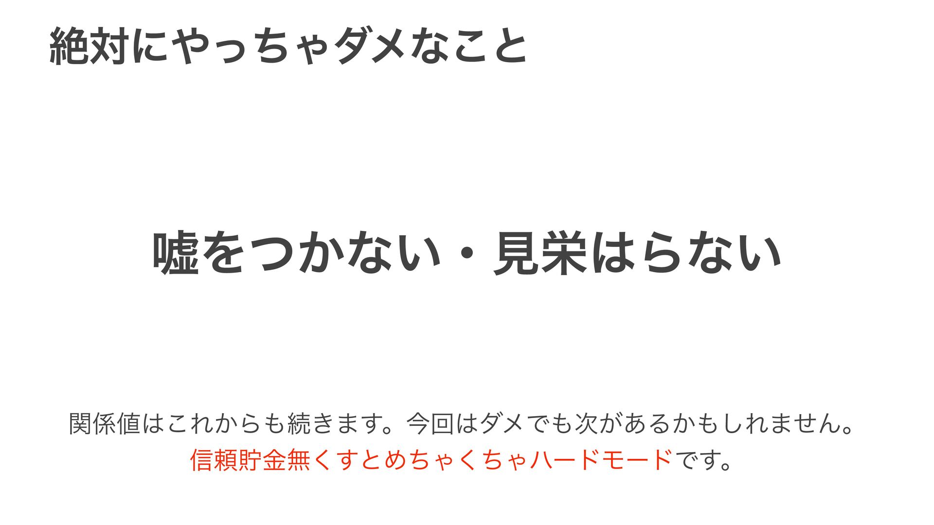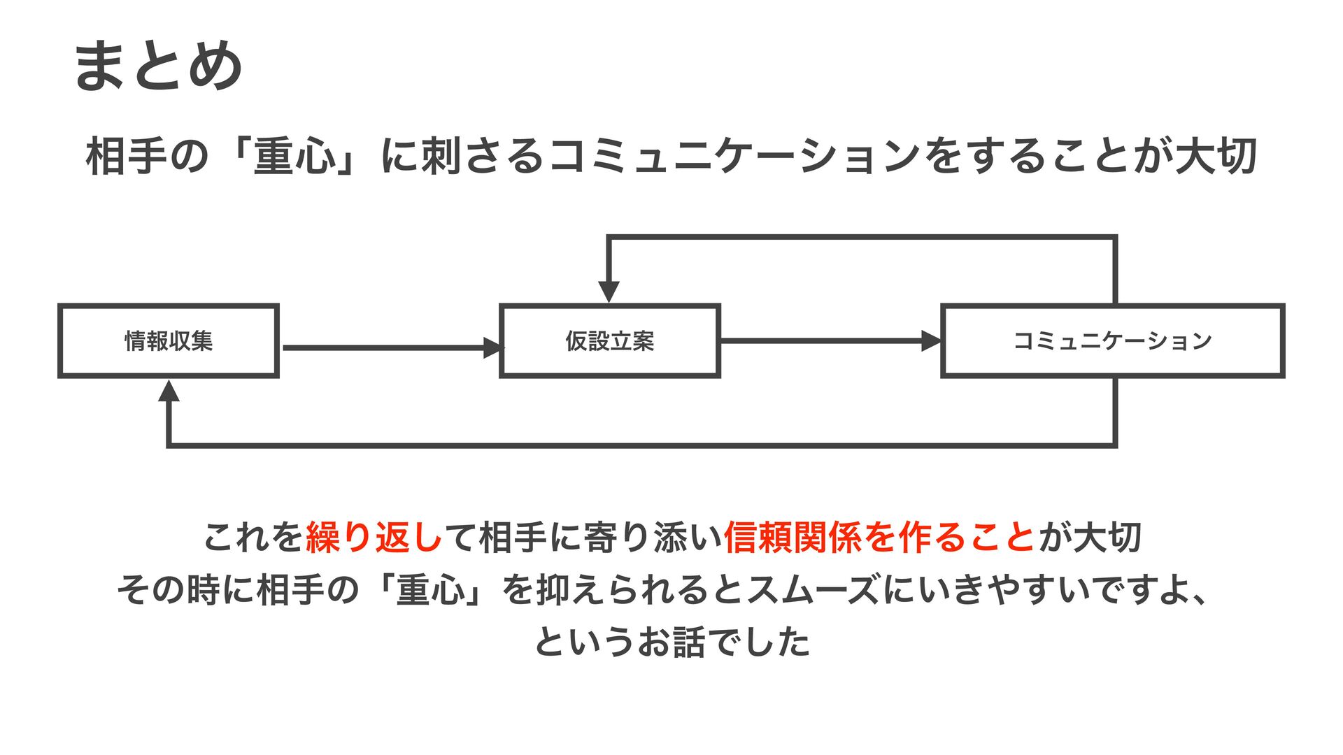 ·ͱΊ ૬खͷʮॏ৺ʯʹ͞ΔίϛϡχέʔγϣϯΛ͢Δ͜ͱ͕େ ใऩू ԾઃཱҊ ίϛϡχέʔγϣϯ ͜ΕΛ܁Γฦͯ͠૬खʹدΓఴ͍৴པؔΛ࡞Δ͜ͱ͕େ ͦͷ࣌ʹ૬खͷʮॏ৺ʯΛ͑ΒΕΔͱεϜʔζʹ͍͖͍͢Ͱ͢Αɺ ͱ͍͏͓Ͱͨ͠