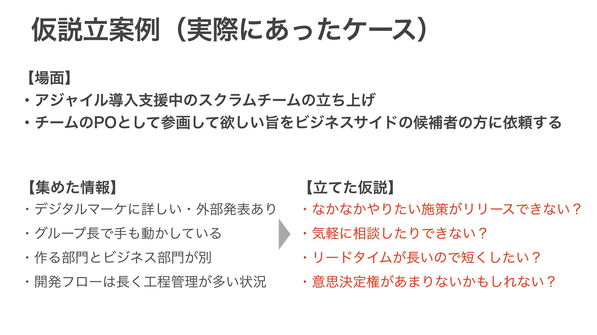 ԾઆཱҊྫʢ࣮ࡍʹ͋ͬͨέʔεʣ ʲ໘ʳ ɾΞδϟΠϧಋೖࢧԉதͷεΫϥϜνʔϜͷ্ཱͪ͛ ɾνʔϜͷ10ͱͯ͠ࢀըͯ͠ཉ͍͠ࢫΛϏδωεαΠυͷީิऀͷํʹґཔ͢Δ ʲूΊͨใʳ ɾσδλϧϚʔέʹৄ͍͠ɾ֎෦ൃද͋Γ ɾάϧʔϓͰखಈ͔͍ͯ͠Δ ɾ࡞Δ෦ͱϏδωε෦͕ผ ɾ։ൃϑϩʔ͘ఔཧ͕ଟ͍ঢ়گ ʲཱͯͨԾઆʳ