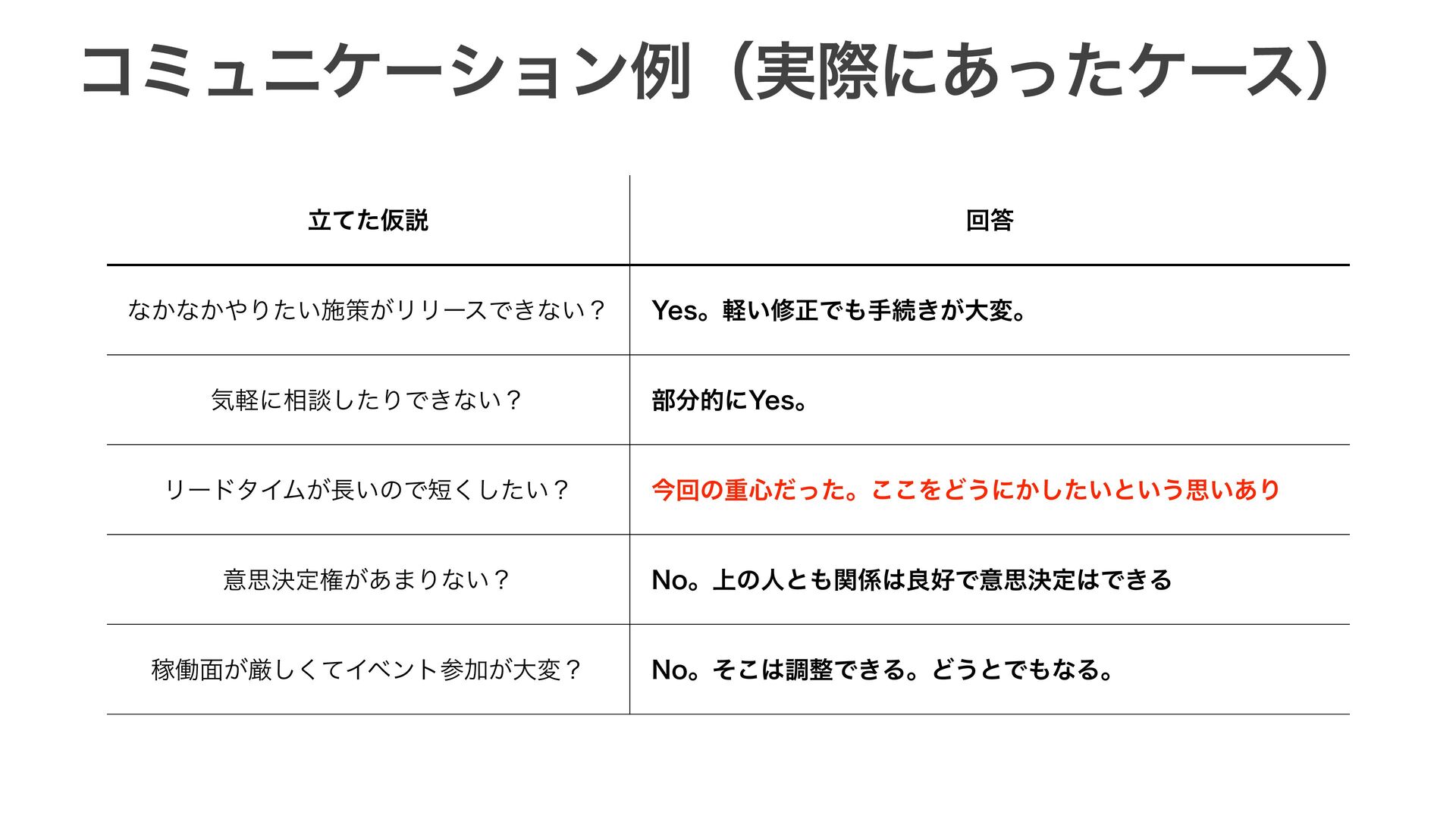 ίϛϡχέʔγϣϯྫʢ࣮ࡍʹ͋ͬͨέʔεʣ ཱͯͨԾઆ ճ ͳ͔ͳ͔Γ͍ͨࢪࡦ͕ϦϦʔεͰ͖ͳ͍ʁ :FTɻ͍ܰमਖ਼Ͱखଓ͖͕େมɻ ؾܰʹ૬ஊͨ͠ΓͰ͖ͳ͍ʁ ෦తʹ:FTɻ ϦʔυλΠϜ͕͍ͷͰ͍ͨ͘͠ʁ ࠓճͷॏ৺ͩͬͨɻ͜͜ΛͲ͏ʹ͔͍ͨ͠ͱ͍͏ࢥ͍͋Γ ҙࢥܾఆݖ͕͋·Γͳ͍ʁ