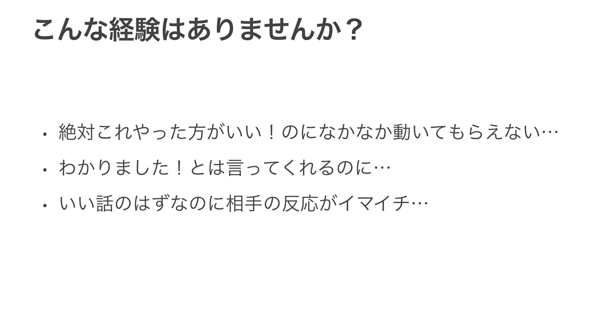 ͜Μͳܦݧ͋Γ·ͤΜ͔ʁ w ઈର͜Εͬͨํ͕͍͍ʂͷʹͳ͔ͳ͔ಈ͍ͯΒ͑ͳ͍ʜ w Θ͔Γ·ͨ͠ʂͱݴͬͯ͘ΕΔͷʹʜ w ͍͍ͷͣͳͷʹ૬खͷԠ͕ΠϚΠνʜ