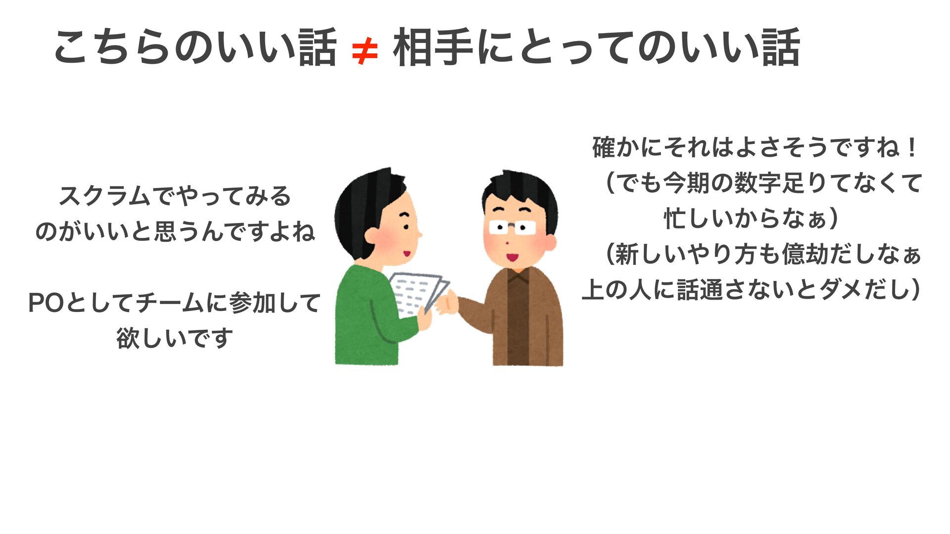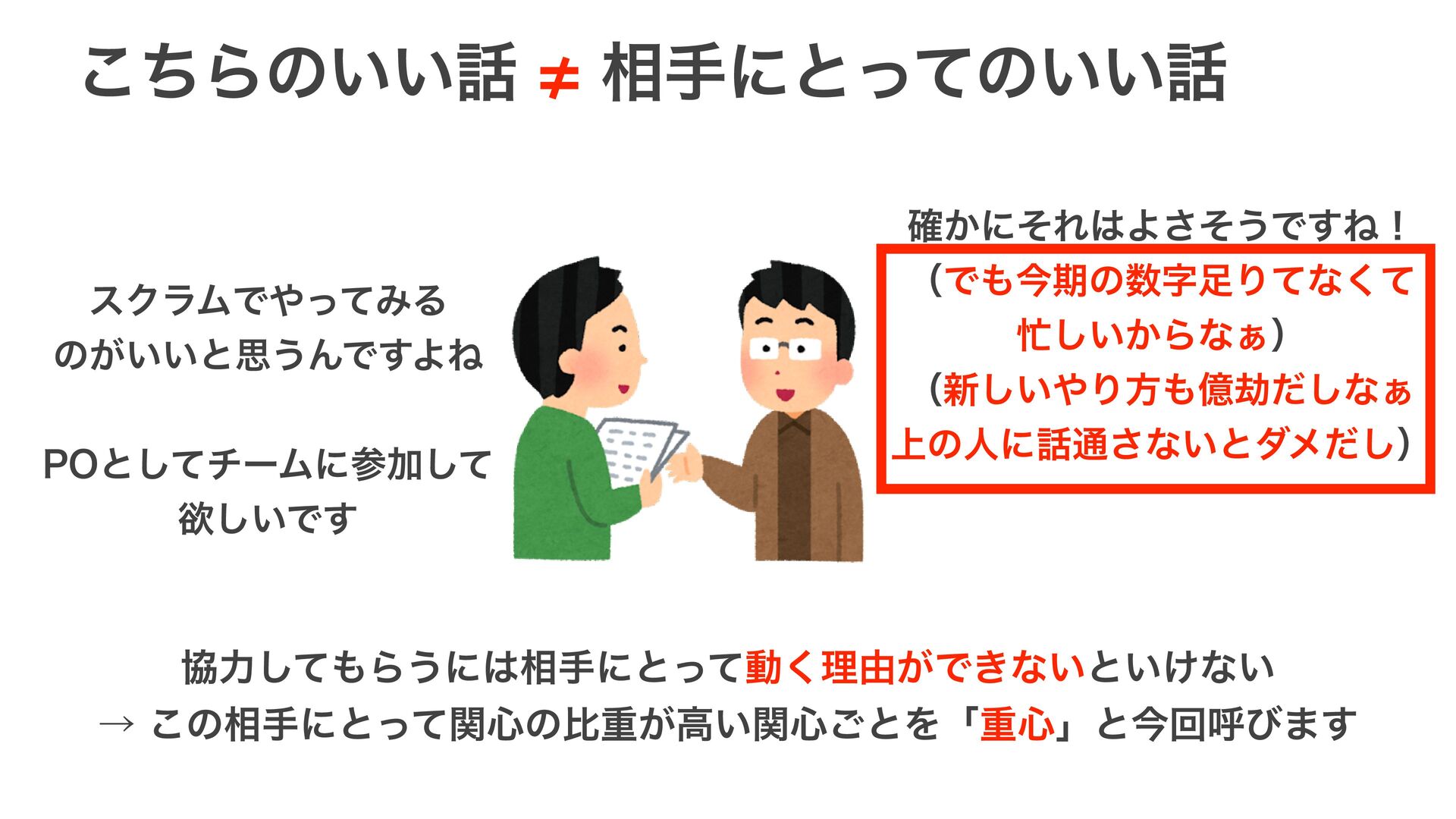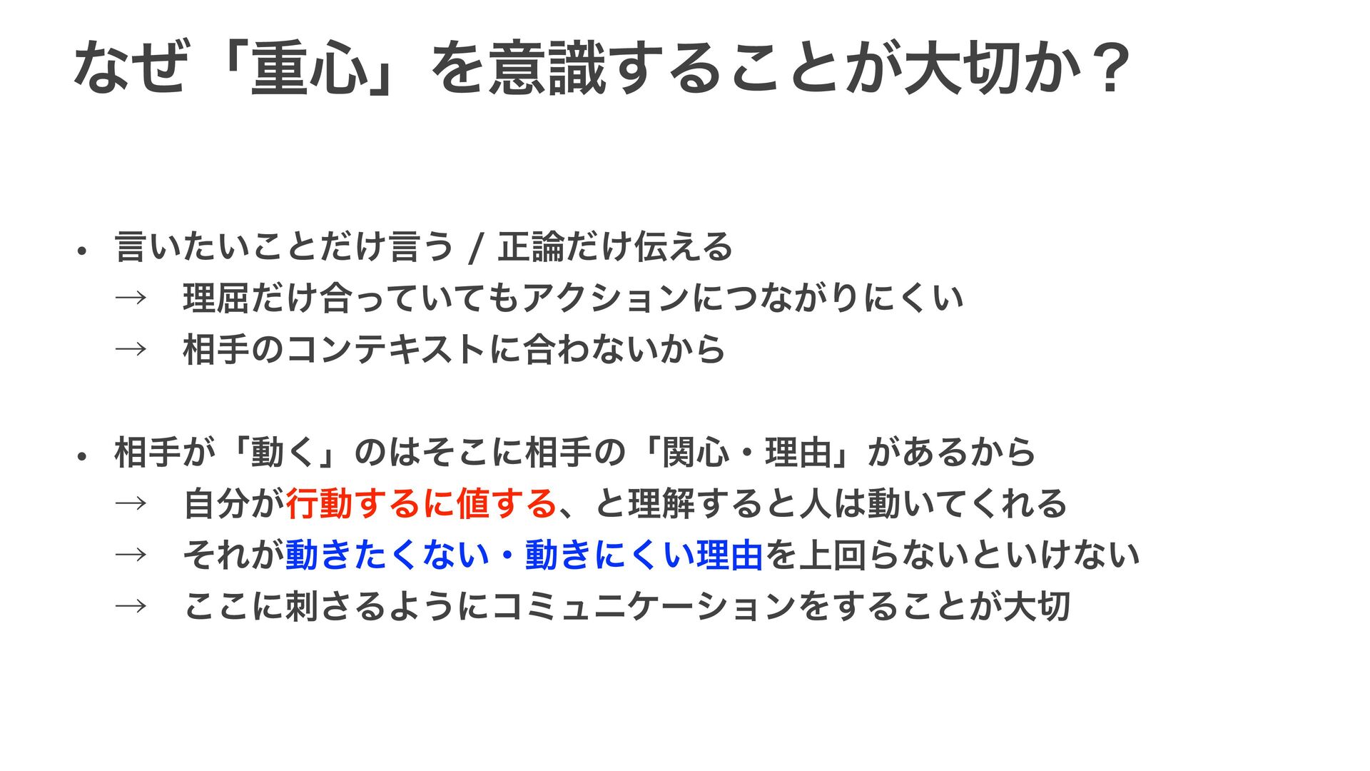 ͳͥʮॏ৺ʯΛҙࣝ͢Δ͜ͱ͕େ͔ʁ w ݴ͍͍ͨ͜ͱ͚ͩݴ͏ਖ਼͚ͩ͑Δ ˠɹཧ۶͚ͩ߹͍ͬͯͯΞΫγϣϯʹͭͳ͕Γʹ͍͘ ˠɹ૬खͷίϯςΩετʹ߹Θͳ͍͔Β w ૬ख͕ʮಈ͘ʯͷͦ͜ʹ૬खͷʮؔ৺ɾཧ༝ʯ͕͋Δ͔Β ˠɹ͕ࣗߦಈ͢Δʹ͢Δɺͱཧղ͢Δͱਓಈ͍ͯ͘ΕΔ ˠɹͦΕ͕ಈ͖ͨ͘ͳ͍ɾಈ͖ʹ͍͘ཧ༝Λ্ճΒͳ͍ͱ͍͚ͳ͍ ˠɹ͜͜ʹ͞ΔΑ͏ʹίϛϡχέʔγϣϯΛ͢Δ͜ͱ͕େ