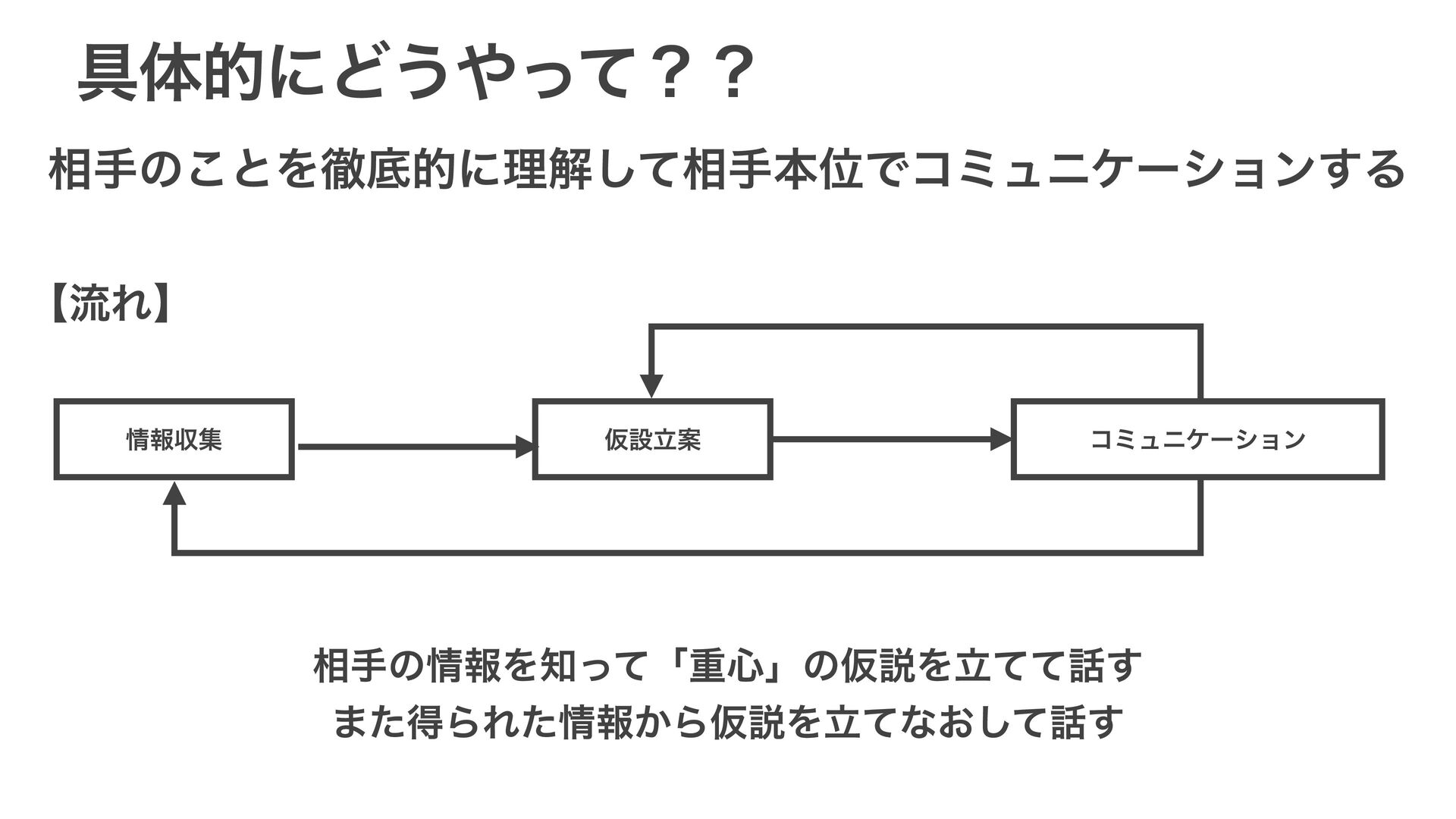 ۩ମతʹͲ͏ͬͯʁʁ ૬खͷ͜ͱΛపఈతʹཧղͯ͠૬खຊҐͰίϛϡχέʔγϣϯ͢Δ ใऩू ԾઃཱҊ ίϛϡχέʔγϣϯ ʲྲྀΕʳ ૬खͷใΛͬͯʮॏ৺ʯͷԾઆΛཱͯͯ͢ ·ͨಘΒΕͨใ͔ΒԾઆΛཱͯͳ͓ͯ͢͠