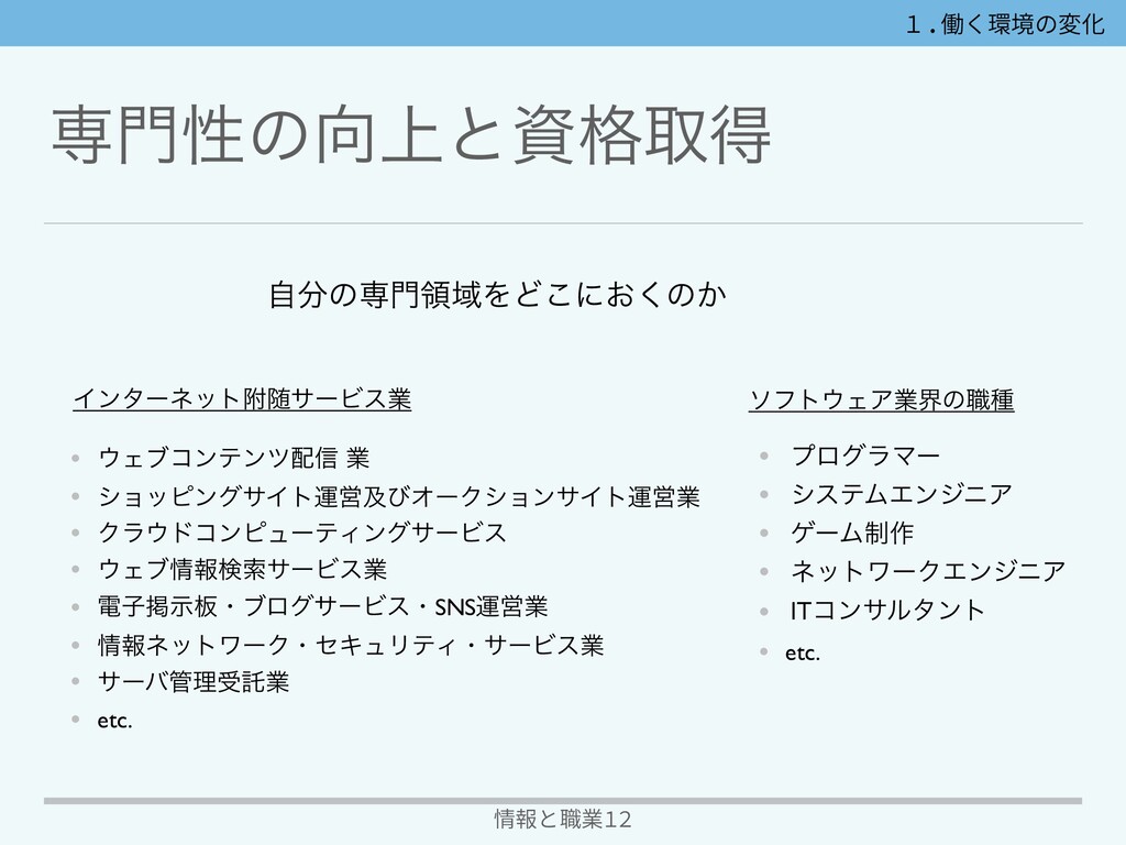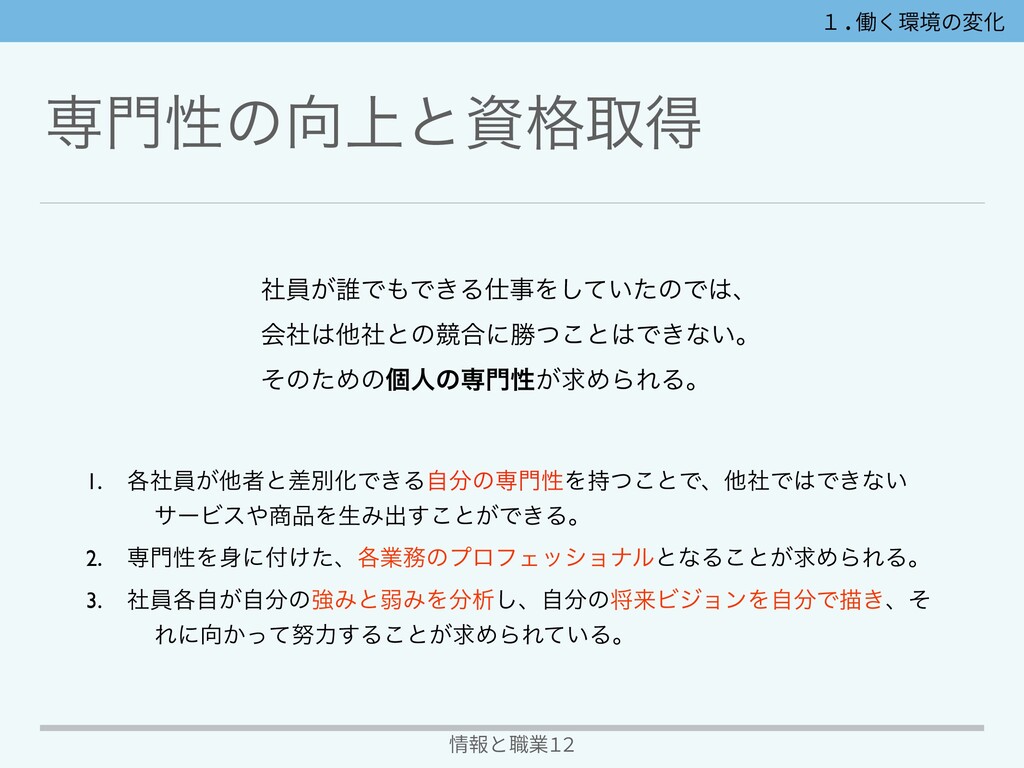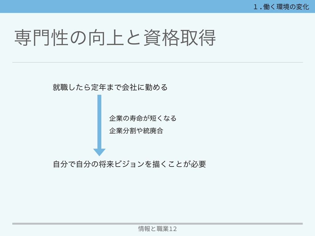 1.働く環境の変化 情報と職業12 ब৬ͨ͠Βఆ·ͰձࣾʹۈΊΔ اۀͷण໋͕͘ͳΔ اۀׂ౷ഇ߹ ઐੑͷ্ͱࢿ֨औಘ ࣗͰࣗͷকདྷϏδϣϯΛඳ͘͜ͱ͕ඞཁ