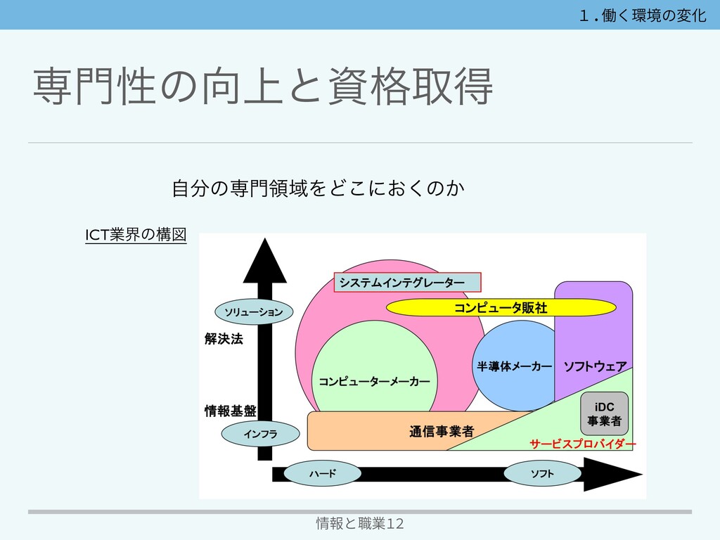 1.働く環境の変化 情報と職業12 ࣗͷઐྖҬΛͲ͜ʹ͓͘ͷ͔ ઐੑͷ্ͱࢿ֨औಘ ICTۀքͷߏਤ