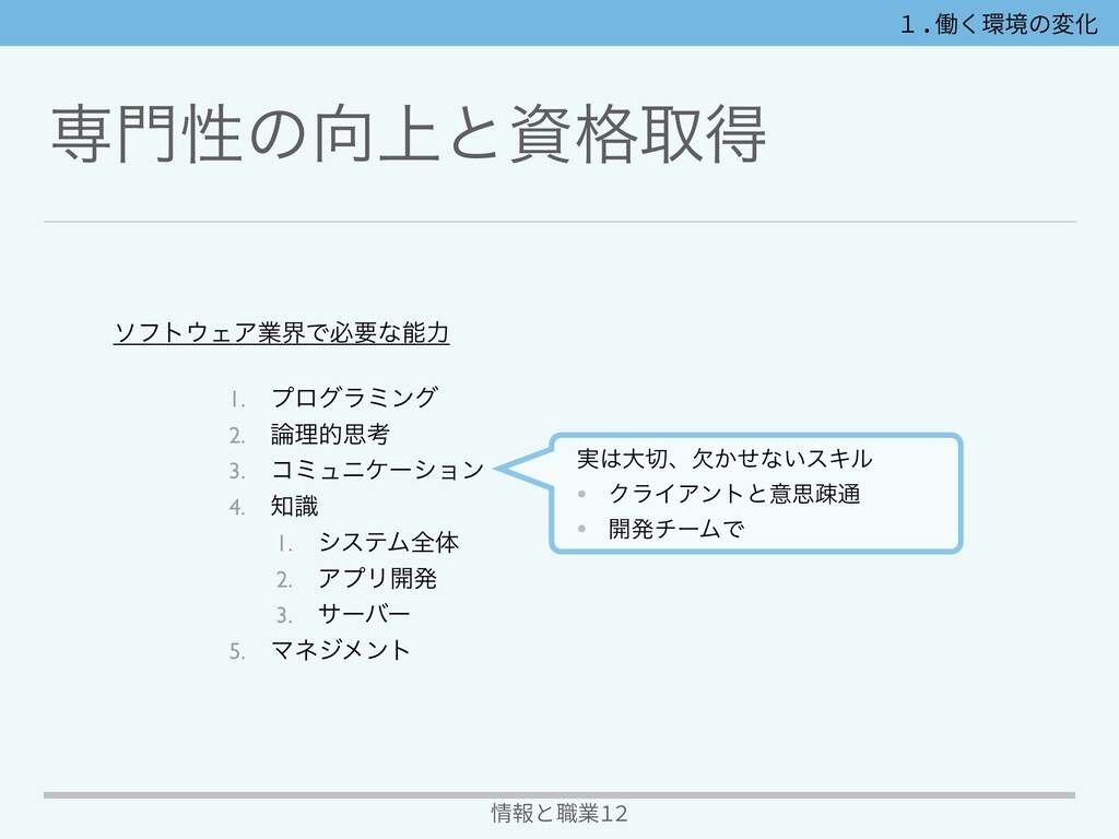 1.働く環境の変化 情報と職業12 ઐੑͷ্ͱࢿ֨औಘ 1. ϓϩάϥϛϯά 2. ཧతࢥߟ 3. ίϛϡχέʔγϣϯ 4.