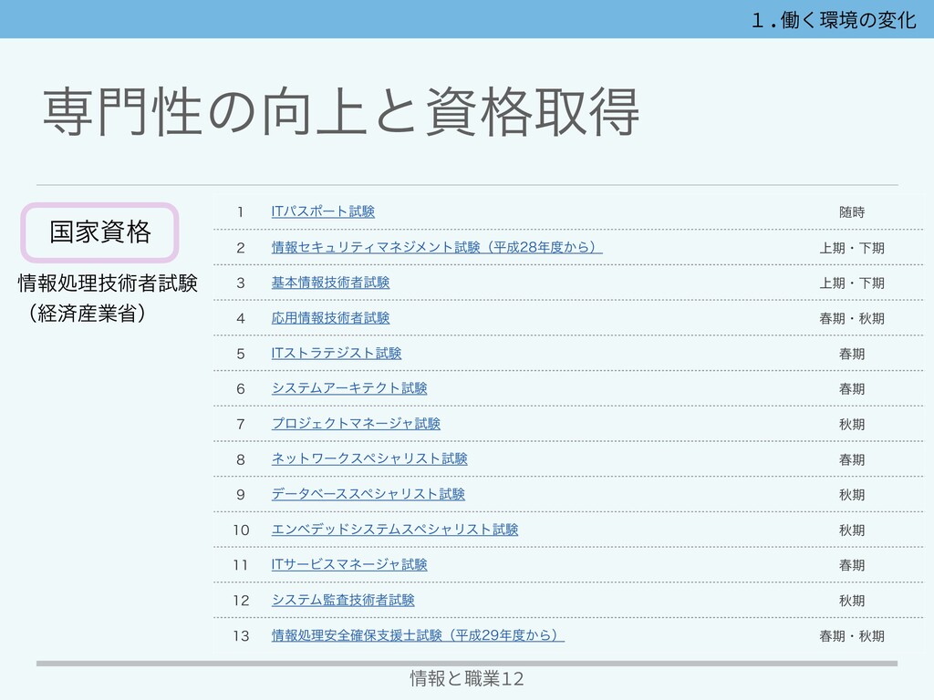 1.働く環境の変化 情報と職業12 ઐੑͷ্ͱࢿ֨औಘ ใॲཧٕज़ऀࢼݧ ʢܦࡁ࢈ۀলʣ *5ύεϙʔτࢼݧ ਵ࣌ ใηΩϡϦςΟϚωδϝϯτࢼݧʢฏ͔Βʣ