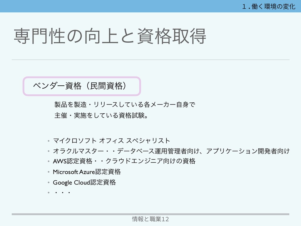 1.働く環境の変化 情報と職業12 ઐੑͷ্ͱࢿ֨औಘ • ϚΠΫϩιϑτ ΦϑΟε εϖγϟϦετ • ΦϥΫϧϚελʔɾɾσʔλϕʔεӡ༻ཧऀ͚ɺΞϓϦέʔγϣϯ։ൃऀ͚ •