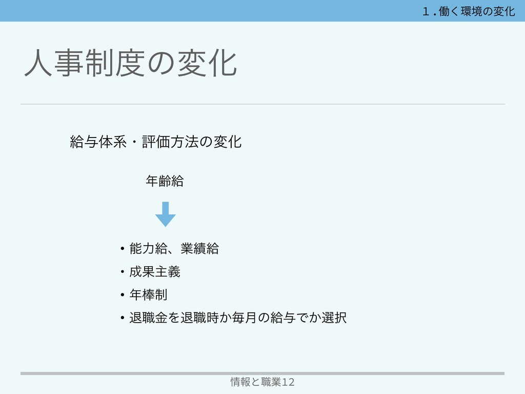 1.働く環境の変化 ਓࣄ੍ͷมԽ 情報と職業12 څ༩ମܥɾධՁํ๏ͷมԽ ྸڅ • ೳྗڅɺۀڅ • Ռओٛ •
