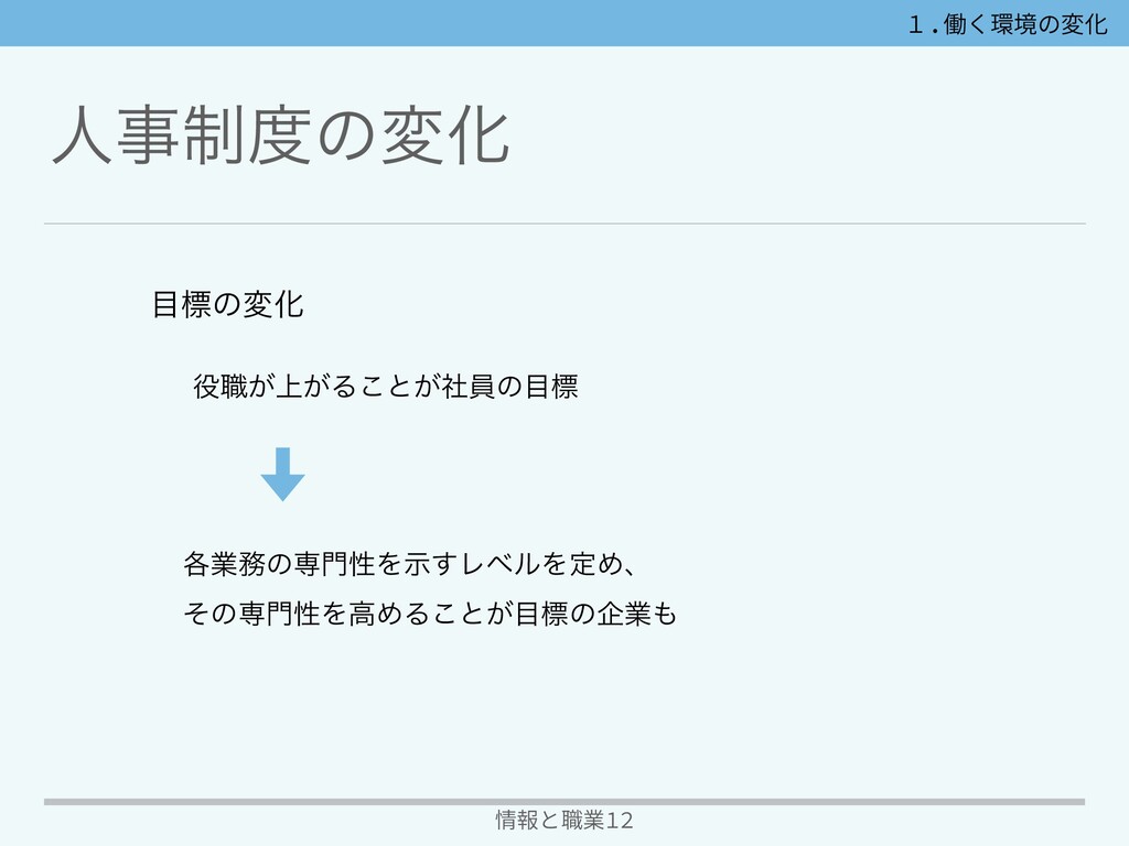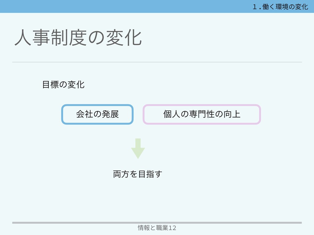 1.働く環境の変化 ਓࣄ੍ͷมԽ 情報と職業12 ඪͷมԽ ྆ํΛࢦ͢ ݸਓͷઐੑͷ্ ձࣾͷൃల