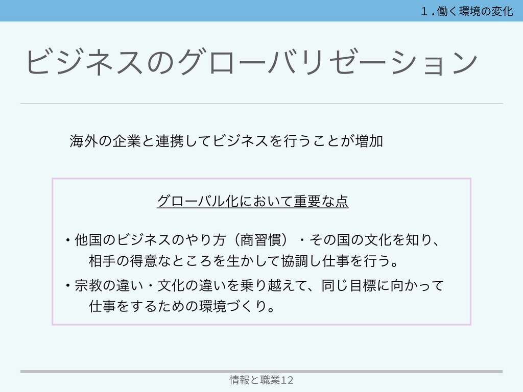 1.働く環境の変化 ϏδωεͷάϩʔόϦθʔγϣϯ 情報と職業12 ւ֎ͷاۀͱ࿈ܞͯ͠ϏδωεΛߦ͏͜ͱ͕૿Ճ άϩʔόϧԽʹ͓͍ͯॏཁͳ • ଞࠃͷϏδωεͷΓํʢश׳ʣɾͦͷࠃͷจԽΛΓɺ ૬खͷಘҙͳͱ͜ΖΛੜ͔ͯ͠ڠௐ͠ࣄΛߦ͏ɻ • फڭͷҧ͍ɾจԽͷҧ͍ΛΓӽ͑ͯɺಉ͡ඪʹ͔ͬͯ