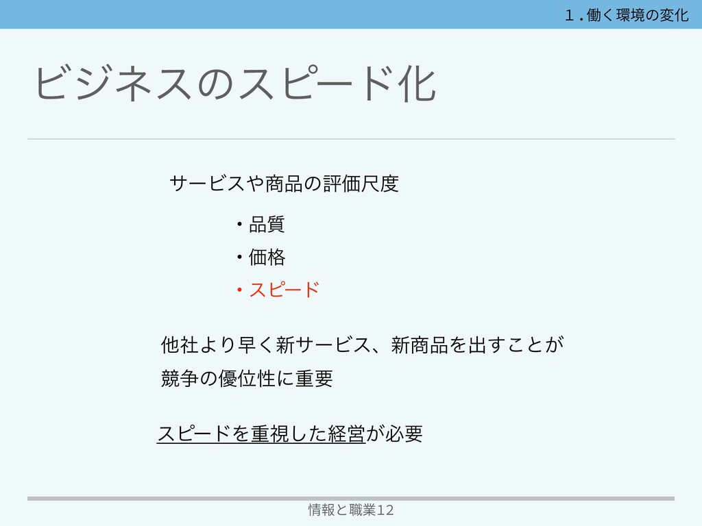 1.働く環境の変化 ϏδωεͷεϐʔυԽ 情報と職業12 αʔϏεͷධՁई • ࣭ • Ձ֨ • εϐʔυ