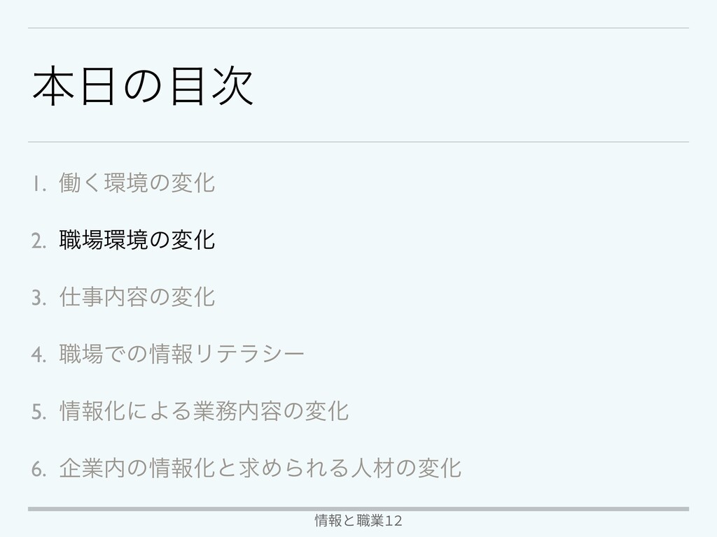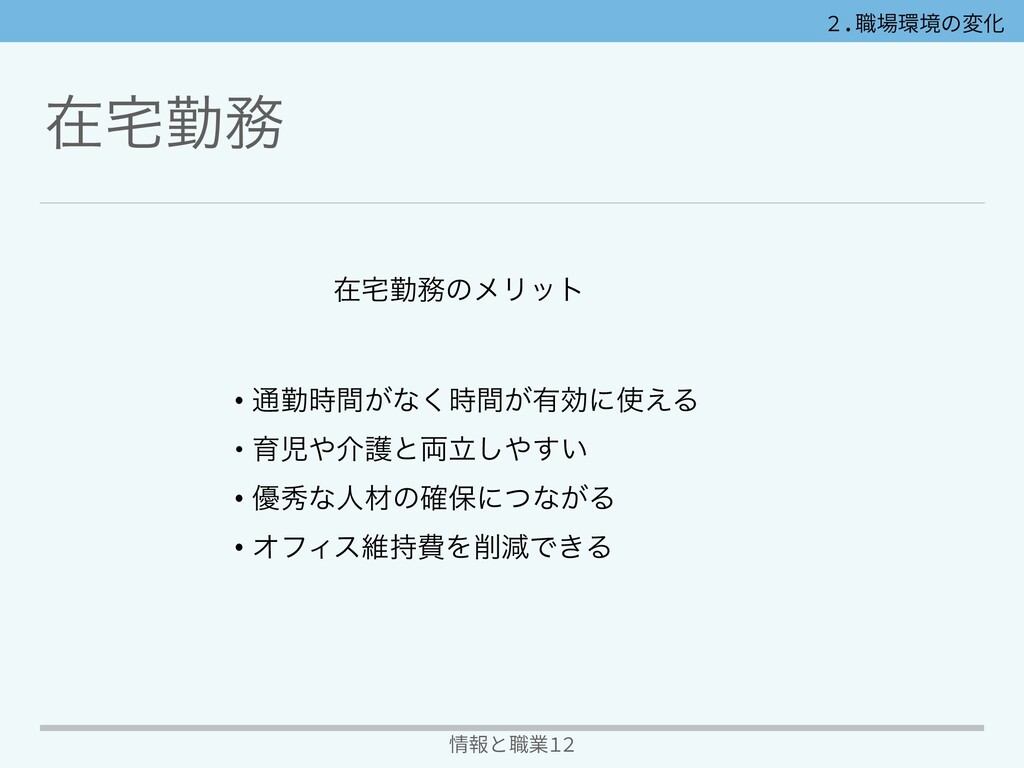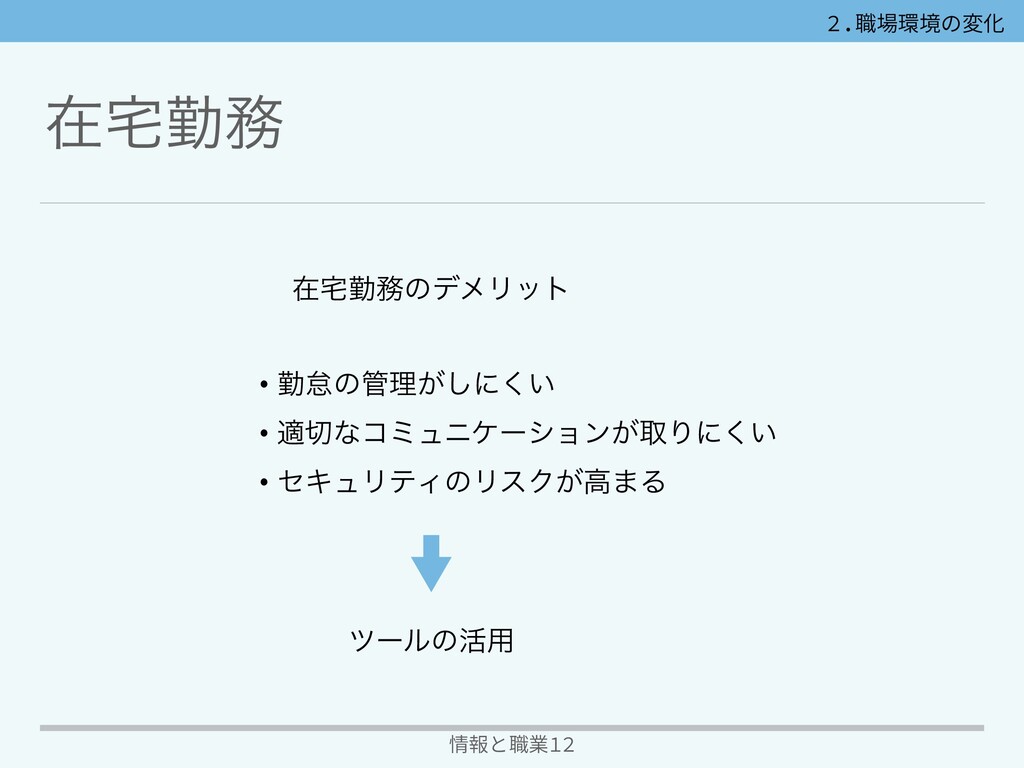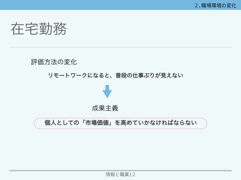 情報と職業12 ධՁํ๏ͷมԽ Ռओٛ ϦϞʔτϫʔΫʹͳΔͱɺීஈͷࣄͿΓ͕ݟ͑ͳ͍ ݸਓͱͯ͠ͷʮࢢՁʯΛߴΊ͍͔ͯͳ͚ΕͳΒͳ͍ ࡏۈ 2.職場環境の変化