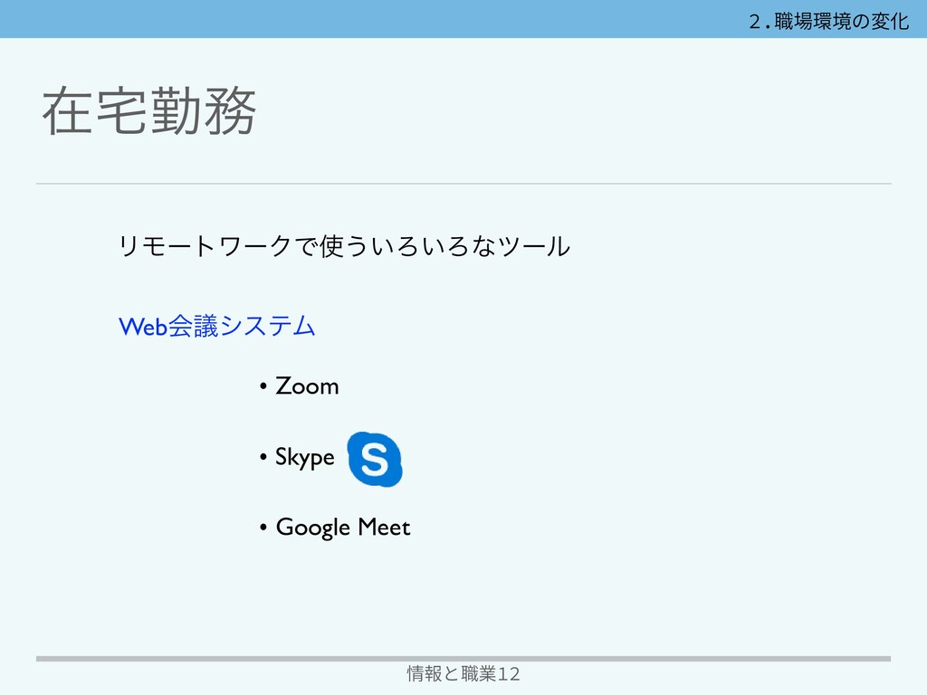 2.職場環境の変化 情報と職業12 ࡏۈ ϦϞʔτϫʔΫͰ͏͍Ζ͍Ζͳπʔϧ WebձٞγεςϜ • Zoo m • Skyp