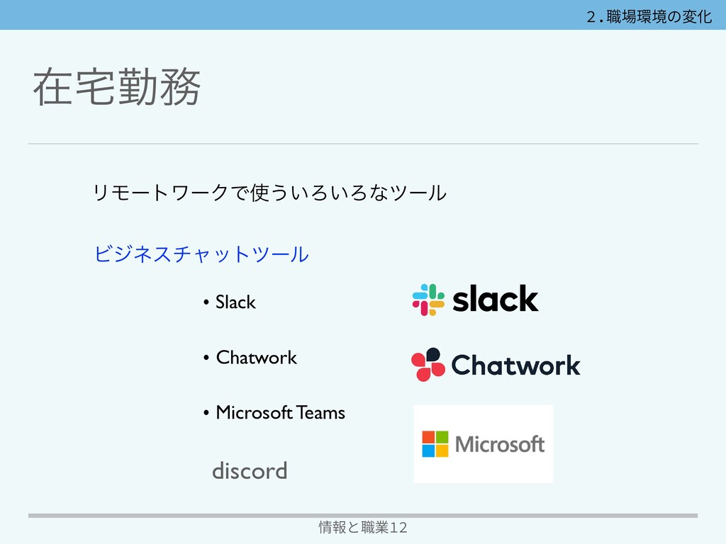 2.職場環境の変化 情報と職業12 ࡏۈ ϦϞʔτϫʔΫͰ͏͍Ζ͍Ζͳπʔϧ Ϗδωενϟοτπʔϧ • Slac k • Chatwor