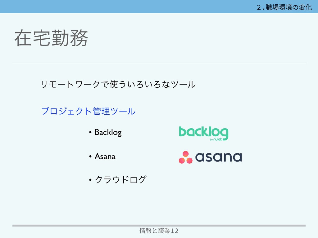 2.職場環境の変化 情報と職業12 ࡏۈ ϦϞʔτϫʔΫͰ͏͍Ζ͍Ζͳπʔϧ ϓϩδΣΫτཧπʔϧ • Backlo g • Asan