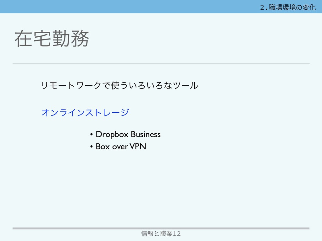 2.職場環境の変化 情報と職業12 ࡏۈ ϦϞʔτϫʔΫͰ͏͍Ζ͍Ζͳπʔϧ ΦϯϥΠϯετϨʔδ • Dropbox Busines s •
