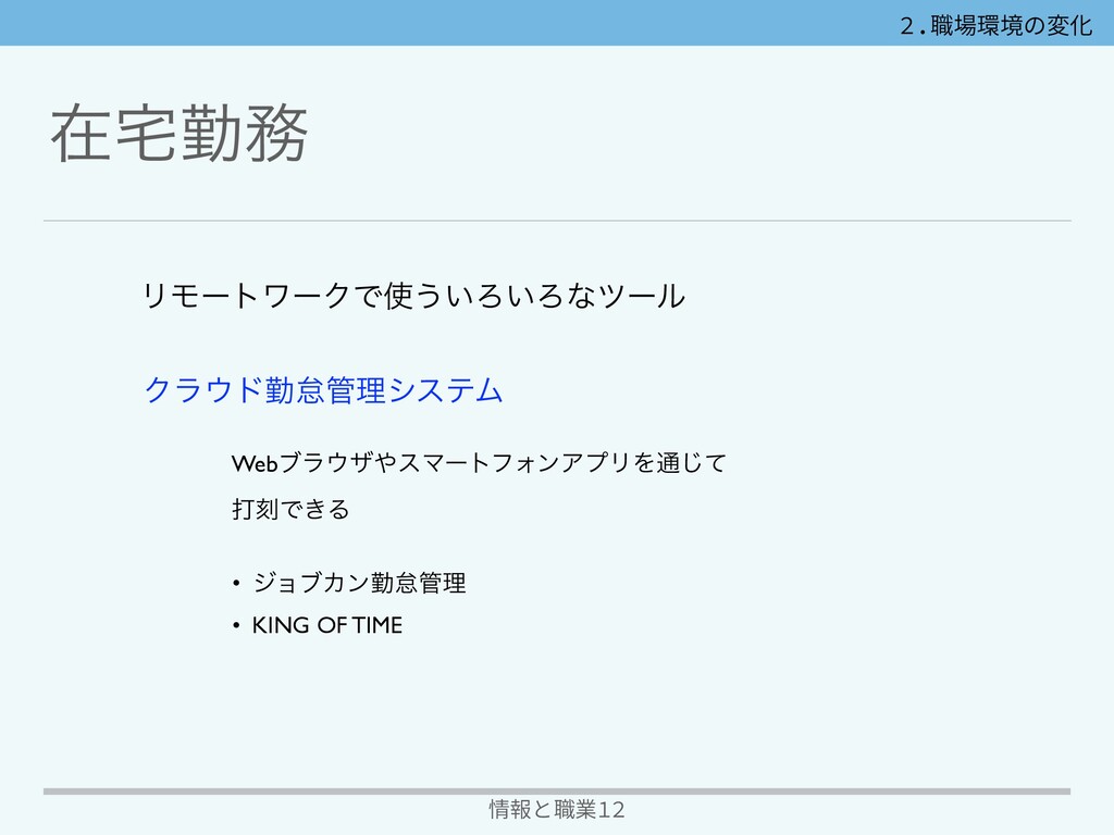 2.職場環境の変化 情報と職業12 ࡏۈ ϦϞʔτϫʔΫͰ͏͍Ζ͍Ζͳπʔϧ ΫϥυۈଵཧγεςϜ WebϒϥβεϚʔτϑΥϯΞϓϦΛ௨ͯ͡ ଧࠁͰ͖Δ • δϣϒΧϯۈଵཧ •