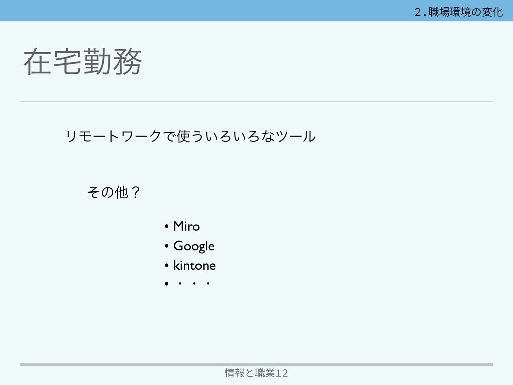 2.職場環境の変化 情報と職業12 ࡏۈ ϦϞʔτϫʔΫͰ͏͍Ζ͍Ζͳπʔϧ ͦͷଞʁ • Mir o • Googl