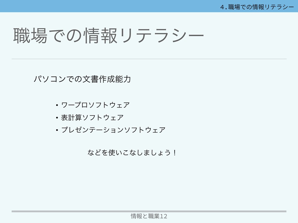 4.職場での情報リテラシー 情報と職業12 ৬ͰͷใϦςϥγʔ ύιίϯͰͷจॻ࡞ೳྗ • ϫʔϓϩιϑτΣΞ • දܭࢉιϑτΣΞ • ϓϨθϯςʔγϣϯιϑτΣΞ