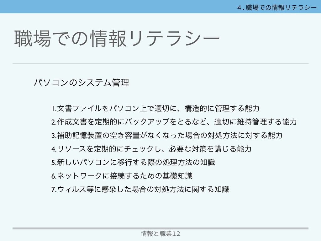 4.職場での情報リテラシー 情報と職業12 ৬ͰͷใϦςϥγʔ ύιίϯͷγεςϜཧ 1.จॻϑΝΠϧΛύιίϯ্Ͱదʹɺߏతʹཧ͢Δೳྗ 2.࡞จॻΛఆظతʹόοΫΞοϓΛͱΔͳͲɺదʹҡ࣋ཧ͢Δೳྗ 3.ิॿهԱஔͷۭ͖༰ྔ͕ͳ͘ͳͬͨ߹ͷରॲํ๏ʹର͢Δೳྗ 4.ϦιʔεΛఆظతʹνΣοΫ͠ɺඞཁͳରࡦΛߨ͡Δೳྗ 5.৽͍͠ύιίϯʹҠߦ͢Δࡍͷॲཧํ๏ͷࣝ 6.ωοτϫʔΫʹଓ͢ΔͨΊͷجૅࣝ