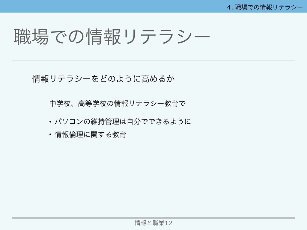 4.職場での情報リテラシー 情報と職業12 ৬ͰͷใϦςϥγʔ ใϦςϥγʔΛͲͷΑ͏ʹߴΊΔ͔ தֶߍɺߴֶߍͷใϦςϥγʔڭҭͰ • ύιίϯͷҡ࣋ཧࣗͰͰ͖ΔΑ͏ʹ • ใྙཧʹؔ͢Δڭҭ