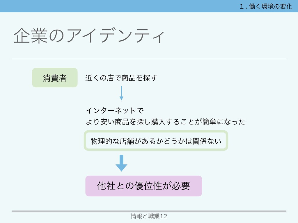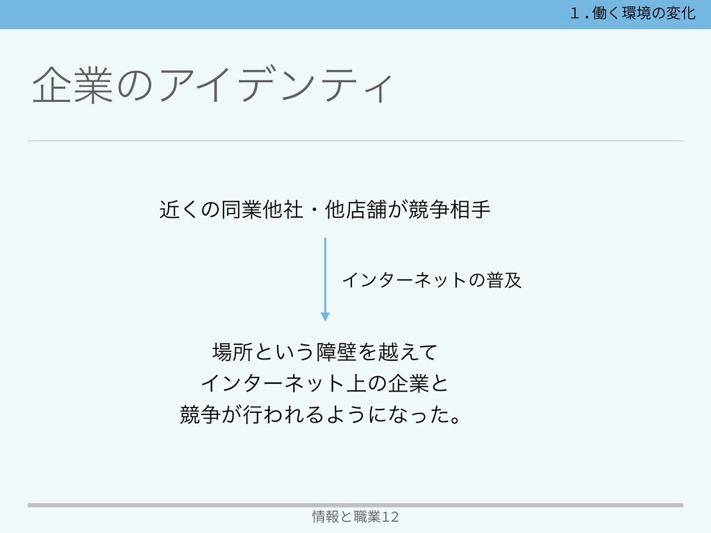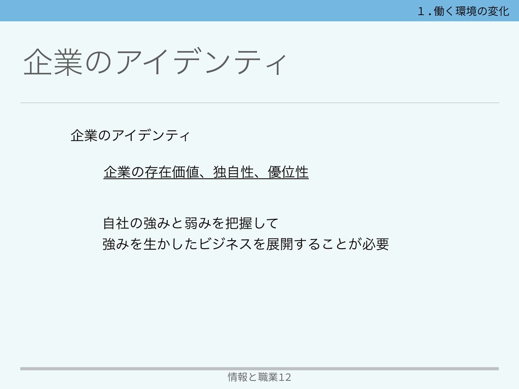1.働く環境の変化 اۀͷΞΠσϯςΟ 情報と職業12 اۀͷΞΠσϯςΟ اۀͷଘࡏՁɺಠࣗੑɺ༏Ґੑ ࣗࣾͷڧΈͱऑΈΛѲͯ͠ ڧΈΛੜ͔ͨ͠ϏδωεΛల։͢Δ͜ͱ͕ඞཁ