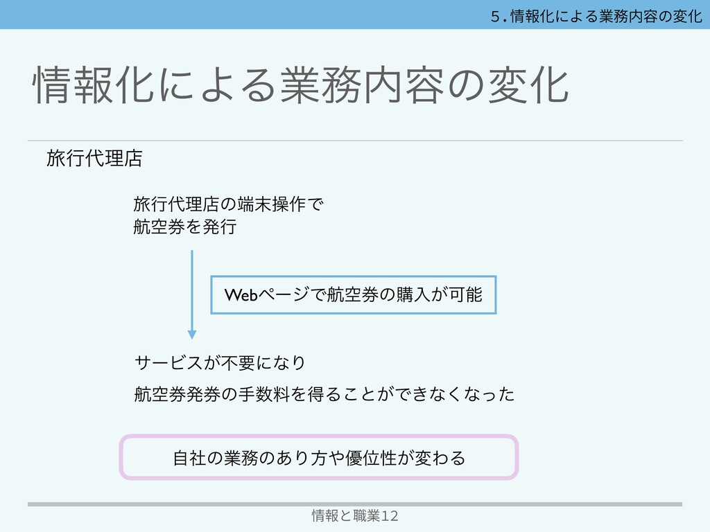 5.情報化による業務内容の変化 情報と職業12 ใԽʹΑΔۀ༰ͷมԽ ཱྀߦཧళ ཱྀߦཧళͷૢ࡞Ͱ ߤۭ݊Λൃߦ WebϖʔδͰߤۭ݊ͷߪೖ͕Մೳ αʔϏε͕ෆཁʹͳΓ ߤۭ݊ൃ݊ͷखྉΛಘΔ͜ͱ͕Ͱ͖ͳ͘ͳͬͨ ࣗࣾͷۀͷ͋Γํ༏Ґੑ͕มΘΔ