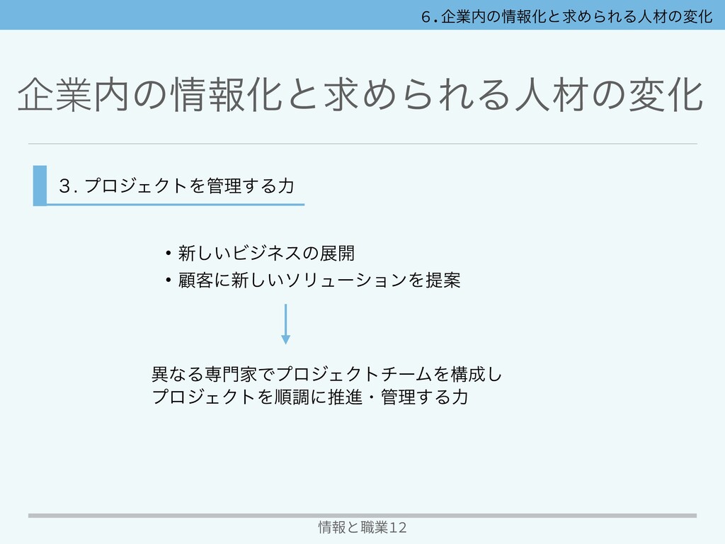 6.企業ͷใԽͱٻΊΒΕΔਓࡐͷมԽ 情報と職業12 اۀͷใԽͱٻΊΒΕΔਓࡐͷมԽ ҟͳΔઐՈͰϓϩδΣΫτνʔϜΛߏ͠ ϓϩδΣΫτΛॱௐʹਪਐɾཧ͢Δྗ • ৽͍͠Ϗδωεͷల։ • ސ٬ʹ৽͍͠ιϦϡʔγϣϯΛఏҊ ̏.