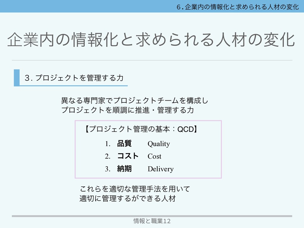 6.企業ͷใԽͱٻΊΒΕΔਓࡐͷมԽ 情報と職業12 اۀͷใԽͱٻΊΒΕΔਓࡐͷมԽ ҟͳΔઐՈͰϓϩδΣΫτνʔϜΛߏ͠ ϓϩδΣΫτΛॱௐʹਪਐɾཧ͢Δྗ 1. ࣭ Quality 2. ίετ