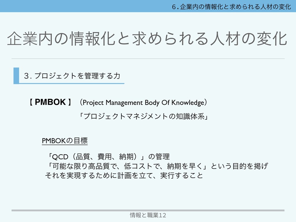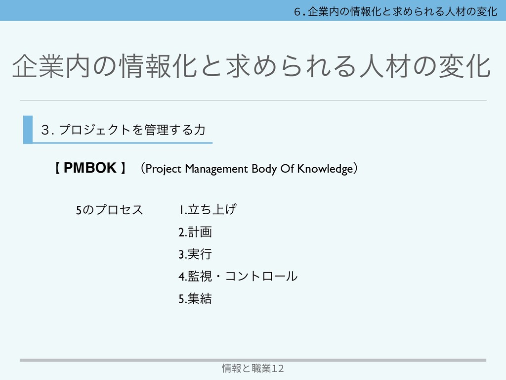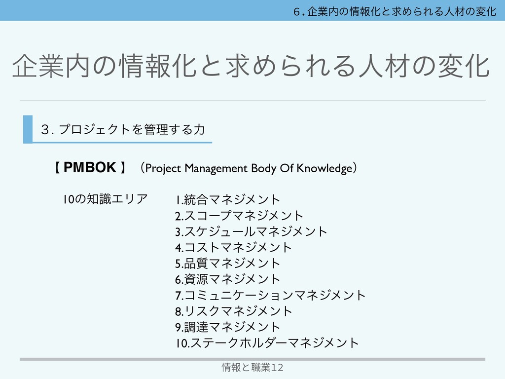 6.企業ͷใԽͱٻΊΒΕΔਓࡐͷมԽ 情報と職業12 اۀͷใԽͱٻΊΒΕΔਓࡐͷมԽ ̏. ϓϩδΣΫτΛཧ͢Δྗ ʲ PMBOK ʳʢProject Management Body