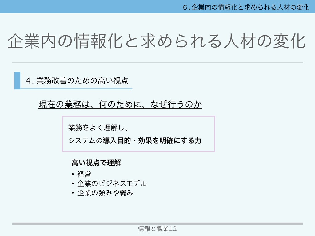 6.企業ͷใԽͱٻΊΒΕΔਓࡐͷมԽ 情報と職業12 اۀͷใԽͱٻΊΒΕΔਓࡐͷมԽ ̐. ۀվળͷͨΊͷߴ͍ࢹ ۀΛΑ͘ཧղ͠ɺ γεςϜͷಋೖతɾޮՌΛ໌֬ʹ͢Δྗ ߴ͍ࢹͰཧղ • ܦӦ